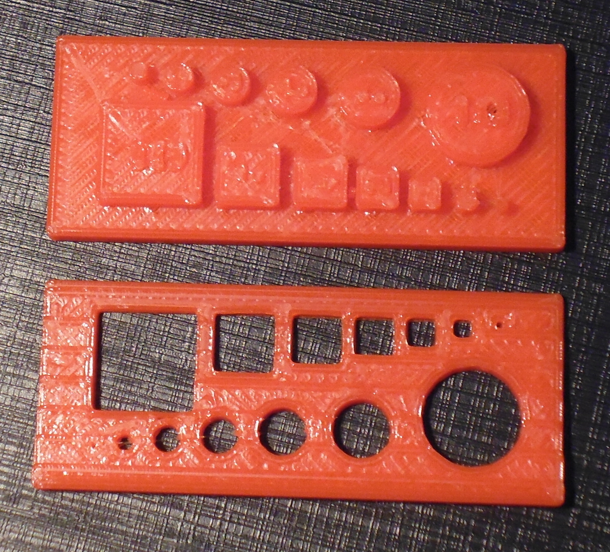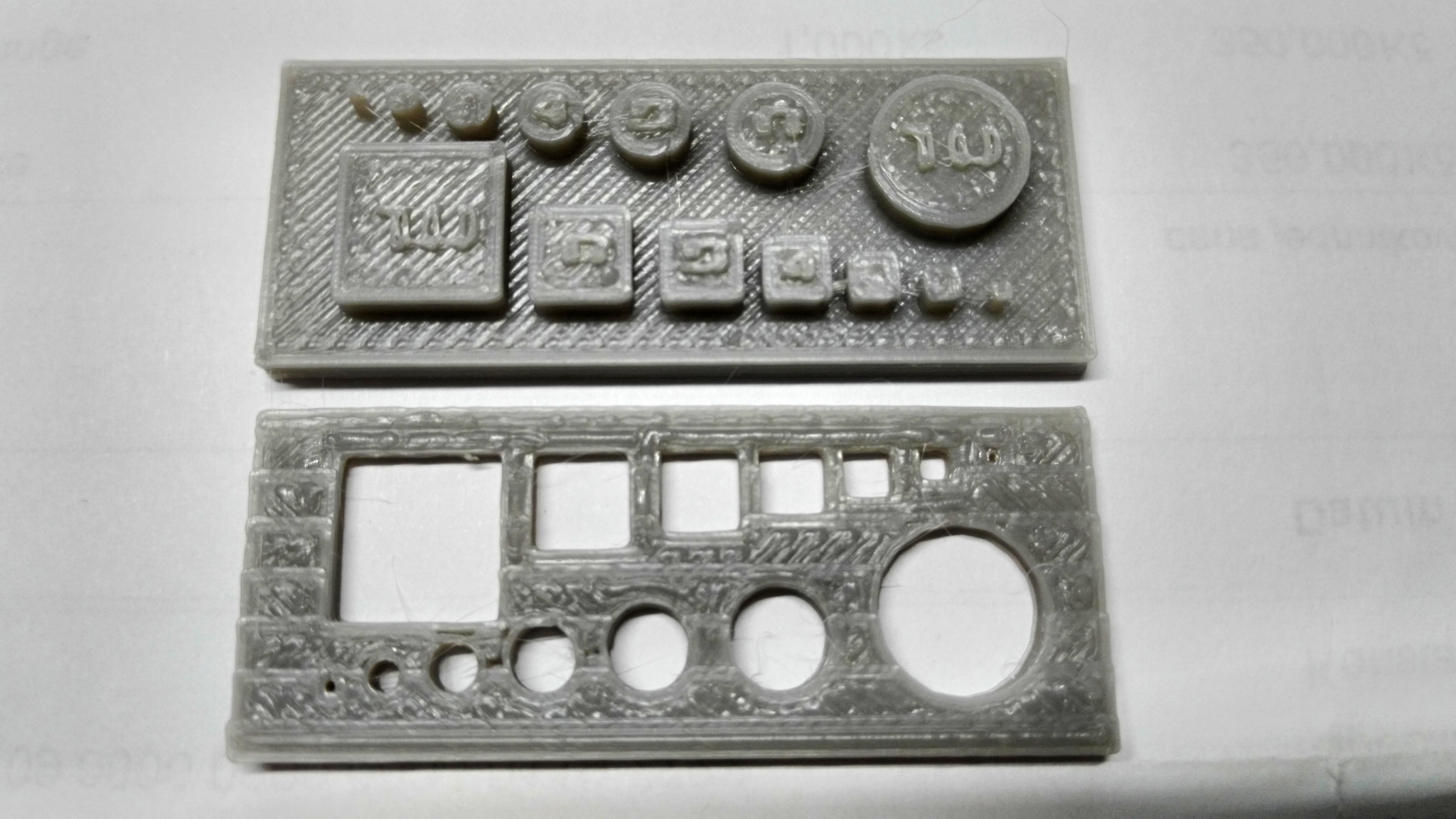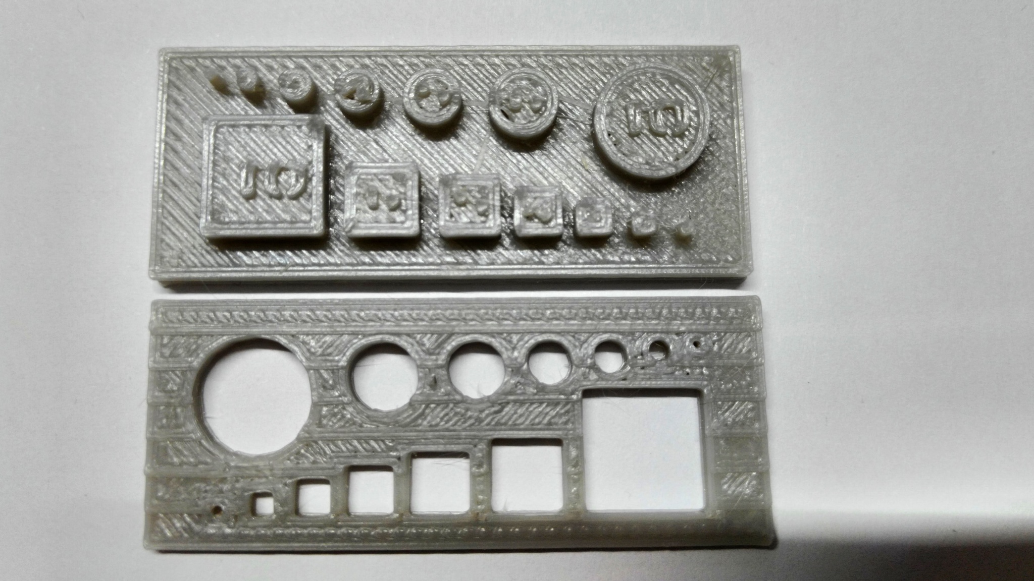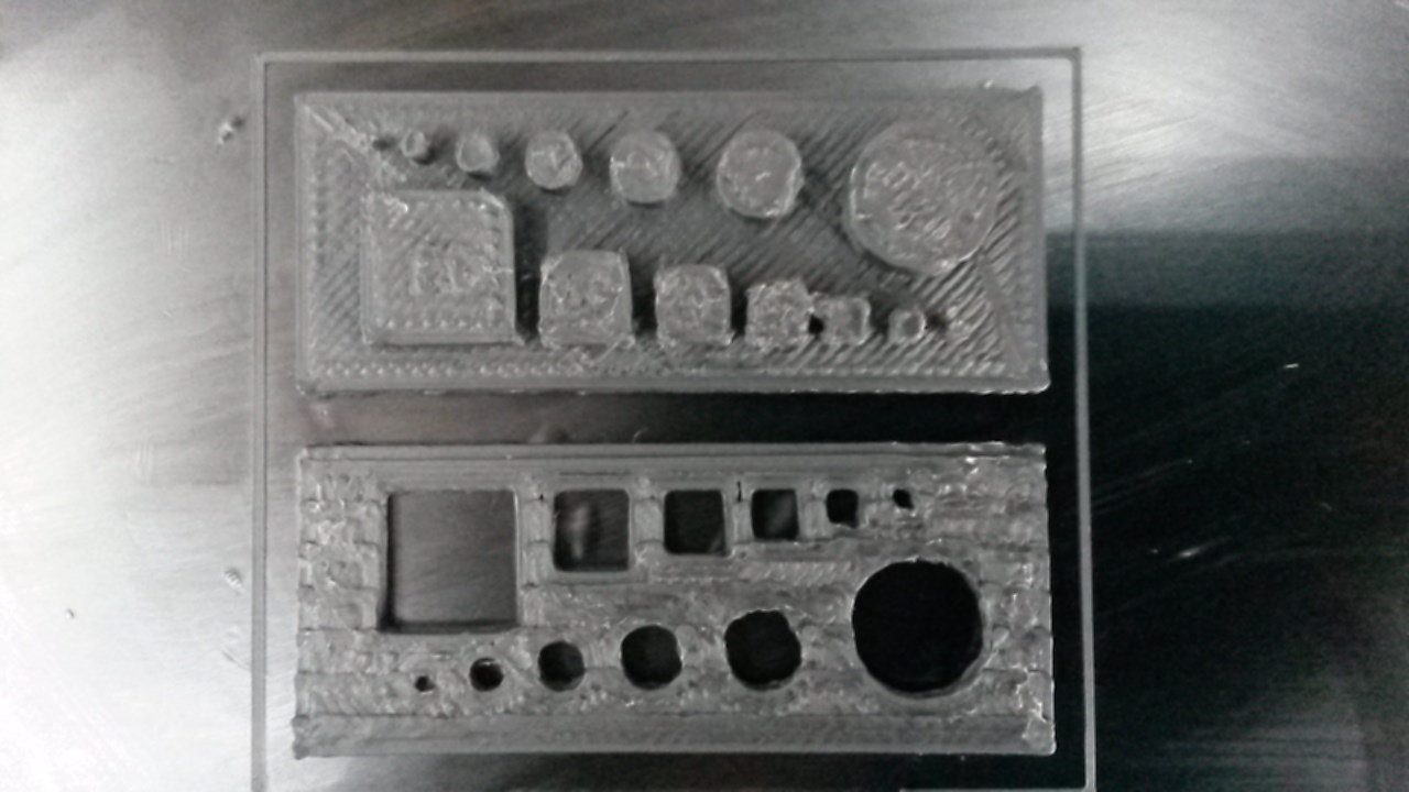 Tisky jsou z testovacího vzorku ABS, které není zatím v prodeji. Tisk při 210°C a oba tisky jely oklolo 25minut s obdobným nastavením slicrů. Tištěno se Z-liftem na RIII s trapézy 8x8 na Z.