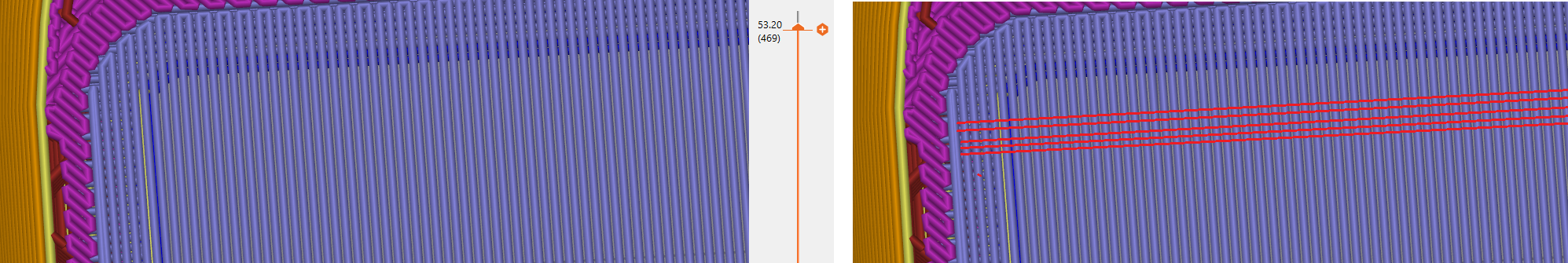 2. Da sa nejako urcit ktorym smerom ma slycer vytvorit mosty? Lebo dnes mi slicer urcil mosty v takom smere, ze ked sa to tlacilo, tak mi pri chladnuti mierne zohlo stenu kedze bola tensia a material PETG. Predtym som tlacil to iste len mierne upravene a slicer urcil smer tak ako na obr. cervenou a to bolo OK. Skusal som natocit model, ale docielil som len to, ze to trvalo dlhsie a tie mosty boli len mierne zosikma.
