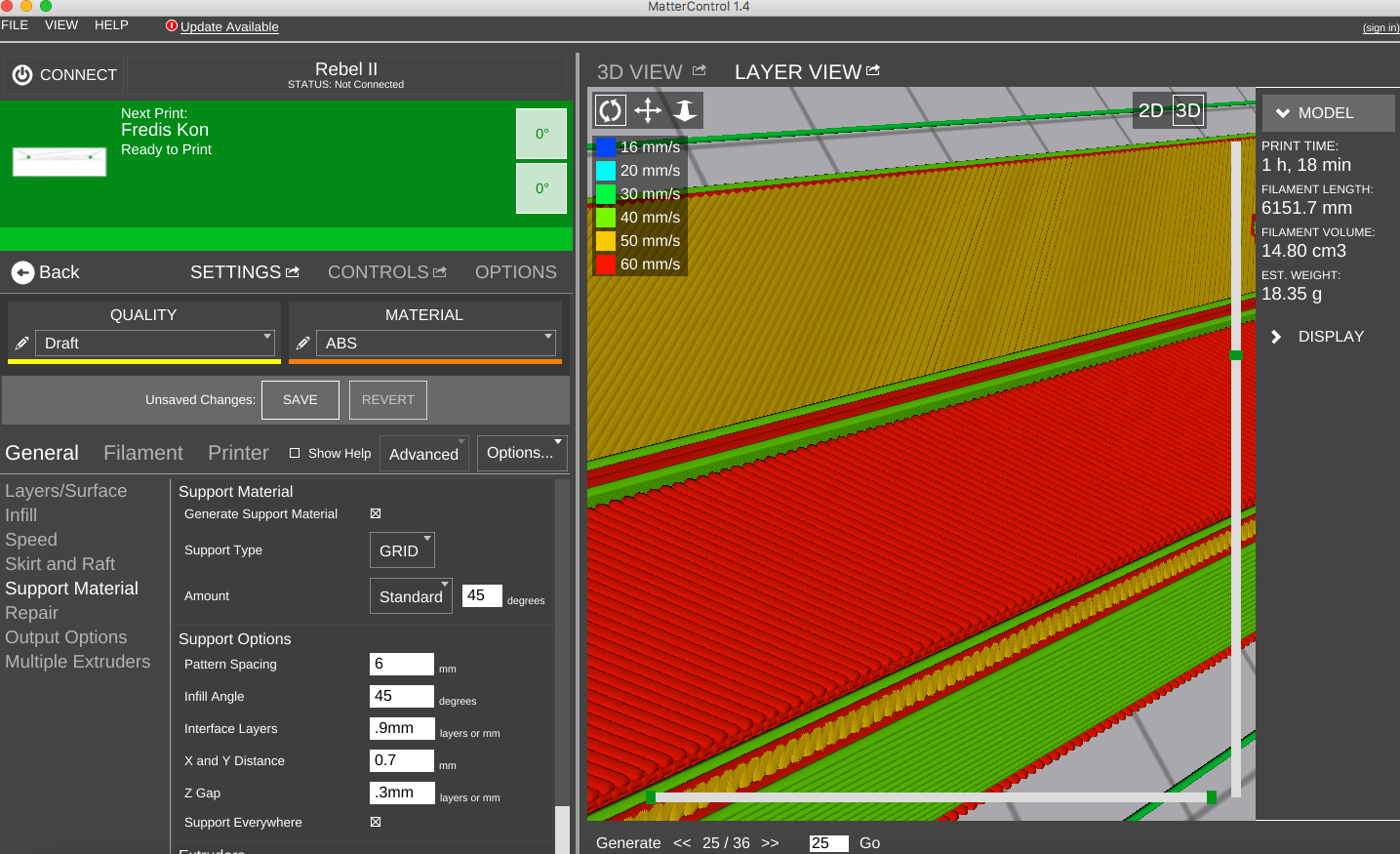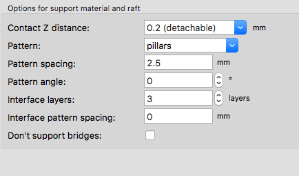 Resim to tak, ze si podpory na model maluju sam. Vetsinou na sirku trysky, ale na zakladnu vzdy alespon 0.5 - 0.6 mm jinak mi to i ty rucne namalovane podpory tiskne az v druhe vrstve tedy ve vzduchu, neresil jsem to, problem jsem obesel rucnim zesilenim prvnich tri vrstev podpor jiz v modelu. Trochu jsem zkousel tisknout na mrizku, ale protoze ji take kreslim rucne, musim pokazde vymazat pruniky apod. tak jsem v tom moc nepokrocil.