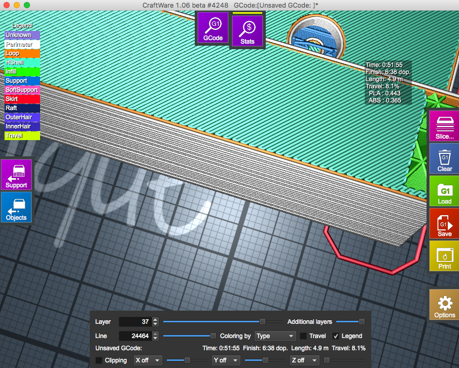 Jelikož je to dutý, tak tisk na podporách. Jenže Slicr mě vygeneroval minimum podpor a z nějakýho neznámýho důvodu tiskne první vrstvu nad podporama jako podélný mosty. To je nepoužitelný, mosty bez podpory dlouhý cca 107 mm. Kdyby tisknul mosty napříč, tak jsou dlouhý jen 12 a 16 mm, to by se vytisklo bez problémů.