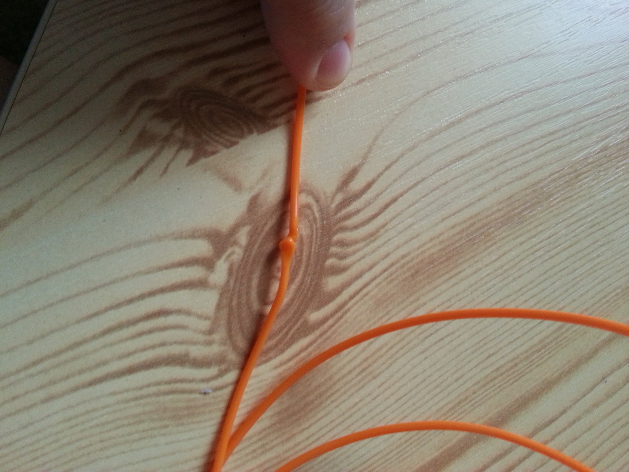 Přiložil jsem fotky, jedna je s nedokončeným výtiskem a druhá s filamentem jak vypadá po vytažení, zdeformované místo je způsobeno zubaticí extruderu.
