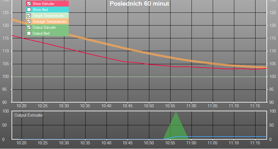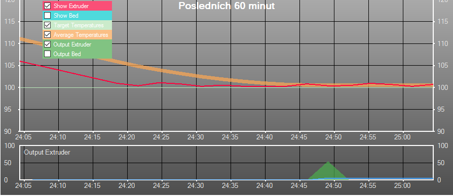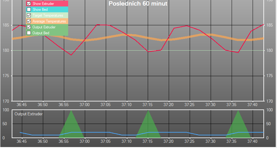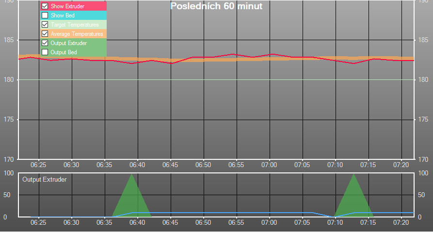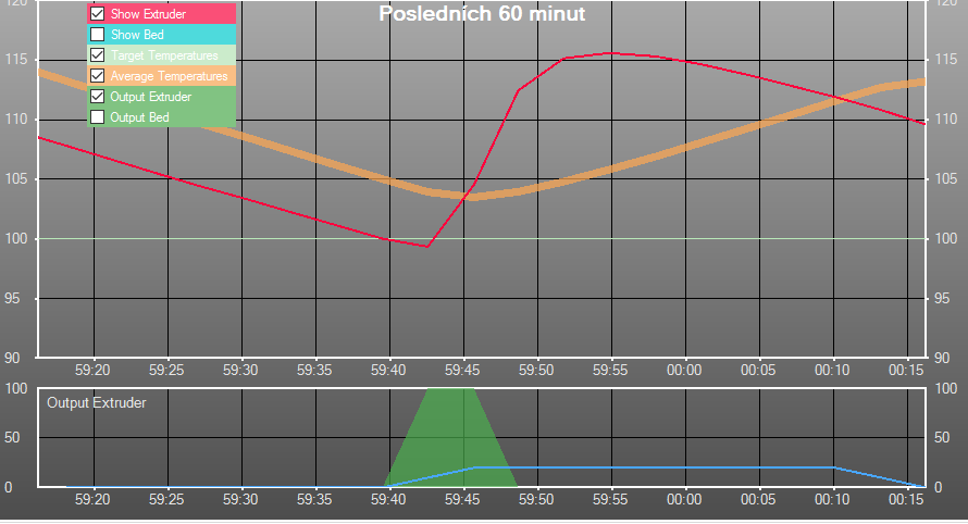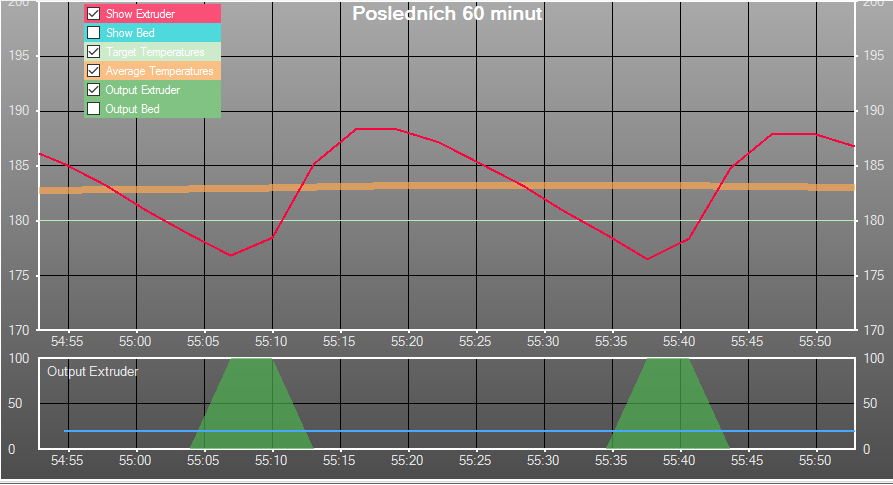 Protože si myslím, že by bylo fajn vidět, jak fungují jednotlivé druhy regulace hotendu, dovolil jsem si udělat jejich přehled vč. grafů z Repetier-host.