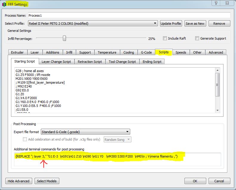 1. V rámci prípravy procesu tlače v Edit process settings vložte do záložky Scripts do časti Post Processing nasledujúci reťazec, ktorý vám zabezpečí zastavenie tlače a umožnenie výmeny filamentu. Tlač sa zastaví pred tlačou novej vrstvy ( v uvedenom príklade č. 3). Číslo vrstvy (červená šípka v obrázku) si môžete zmeniť podľa potreby.
