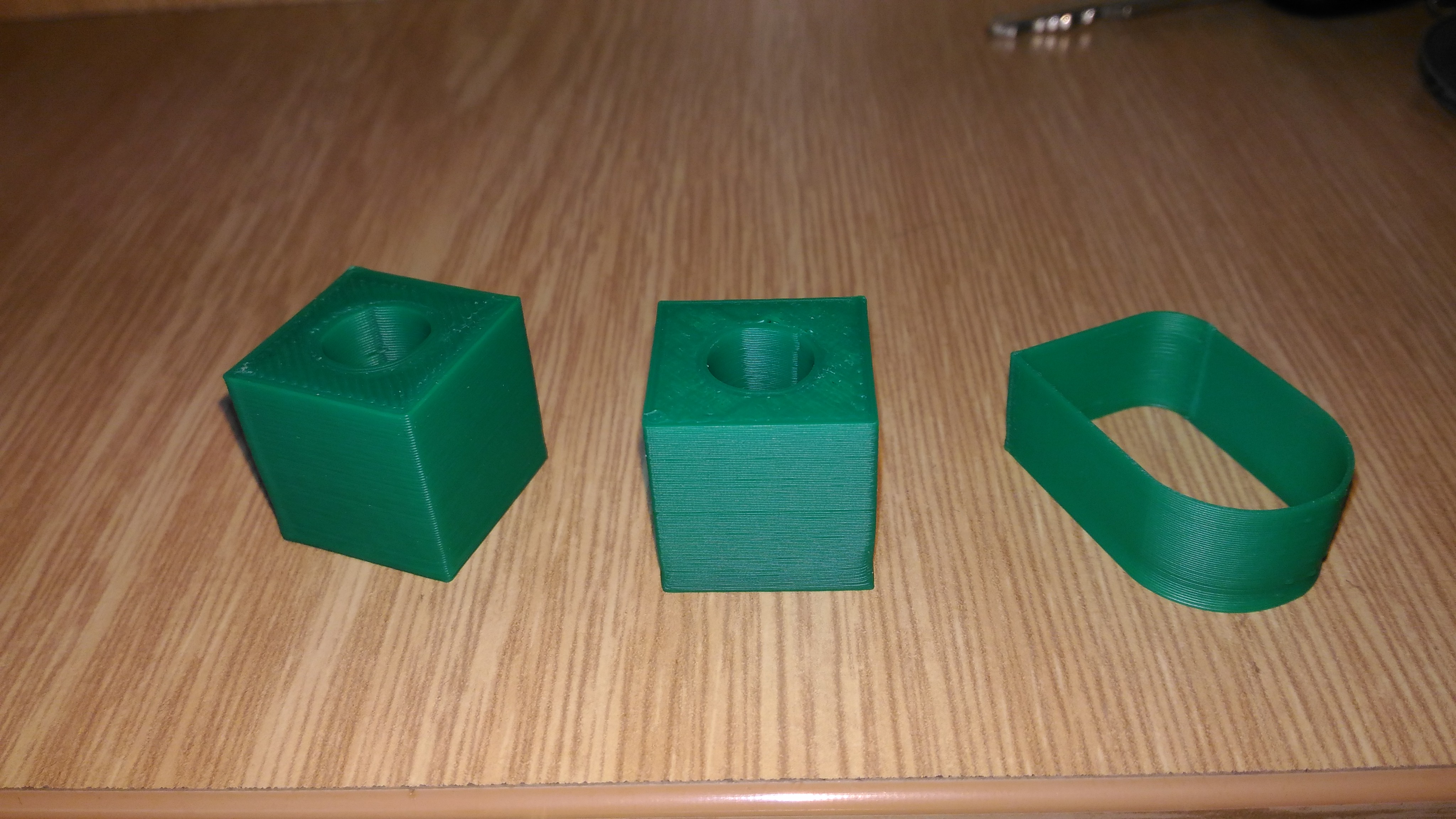 To co je pro všechny rozběhy stejné ( bez ohledu jak to stavitel pečlivě sestavil ) je kalibrace a zjištění jak se vlastně tiskárna chová . Je třeba tedy prvně začít s kalibrací extruderu ( zadáte podej 50 mm filamentu ,tak ho musí 50 mm podat )a přitom se díváte jestli se zubatice pravidelně zakusuje do materiálu a podává dobře nebo proklouzává( je třeba zvětšit přítlak ) . Teprve po tomto si přišroubujete na správné místo hotend a zasunete do něj filament. nahřejete ručně hotend pro ABS na 240°C ,po nahřátí buď změříte teploměrem skutečnou teplotu na trysce nebo rukou vymáčknete přítlak filamentu a zkusíte zatlačit filament do hotendu zda půjde lehce tlačit .Zadáte podej třeba 20 mm a díváte se jak se tvaruje roztavené vlákno pod tryskou ( padá rovně dolů , točí se vzhůru ,namotává se jako kulubíčko , objevují se bublinky ve vláknu ) a zda zubatice stíhá podávat . Teprve až nyní můžete přistoupit k nějakému se snažení položit něco na stolek ( teplotu pro daný materiál jste zjistil testem viz. výše a extruder by měl podávat 100% materiálu protože jste ho zkalibroval ). na tiskárně si seštělujete Home hlavně v Z ose ,tak aby ve všech 4 rozích byla tryska stejně vysoko nad stolkem ( řádově 0,15 až 0,25 pro výšky vrstev 0,2 mm s tryskou 0,4 mm) .