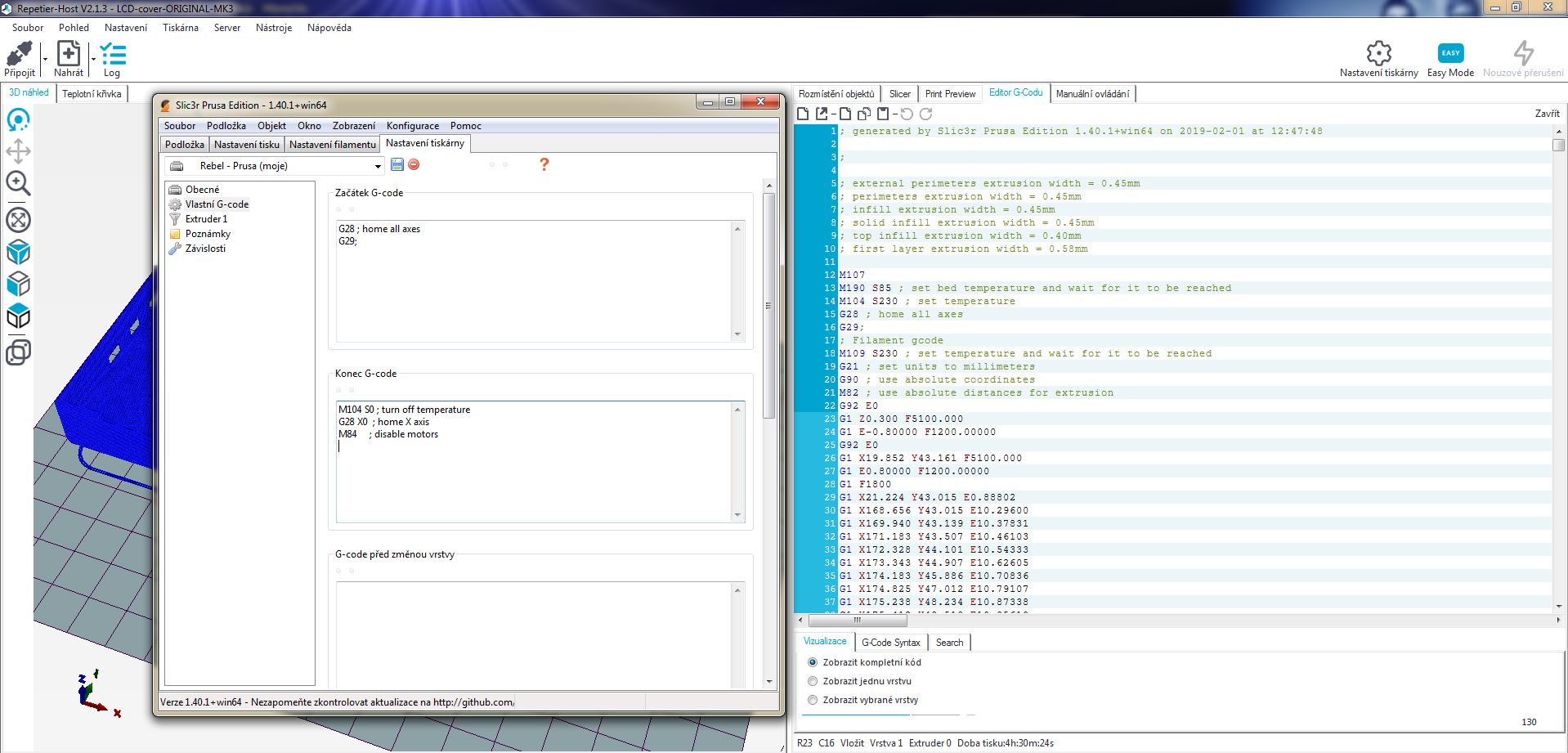 Tam mám to samé co ty. Na co jsem ovšem díky zkoumání holého G-kodu přišel že pokaždé když operuje s osou Z tak má rychlost F5100 - ovšem podle mě, když zvedá jenom o 0.2mm, tak to zvládne...(z kodu G29 jede pak z cca 6-10mm dolů) viz G-kod, kde tohle je postup na další vrstvu, pokud to tak chápu...