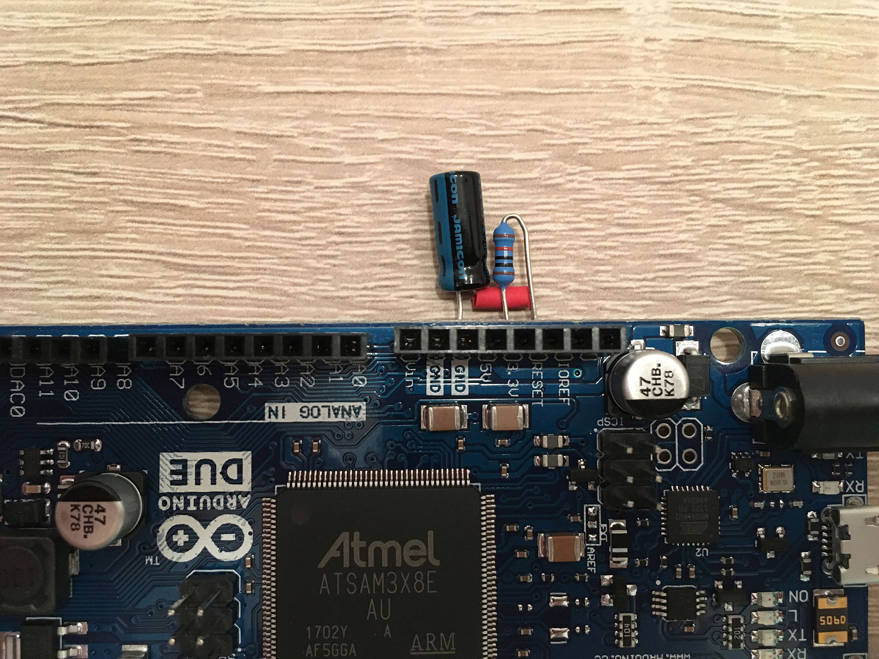 Ještě zde zveřejním malou úpravu Arduina. Po zapnutí zdroje Arduino DUE s RADDS deskou nenaběhne, je třeba stisknout Reset. Toto lze vyřešit přidáním rezistoru 10k a kondenzátoru 100uF na Reset pin, viz fotky.