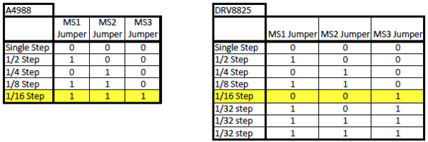 Propojkami pod drivery se nastavuje mikrokrokování. Všechny 3 zapojené znamená max. mikrokroků, které driver nad nimi zvládne ( A4988 16 a DRV8825 32), jejich kombinacemi (zapojeny jen některé) se počet mikrokroků snižuje. Po nahrazení driverů pozor na orientaci, tyto dva jsou oproti sobe otočeny o 180 stupňů (dáno polohou trimru nebo popisem nožiček zespoda driveru). Poté se musí poupravit počet kroků na mm v EEPROM na dvojnásobek (A4988>DRV8825 ) nebo na polovinu (DRV8825>A4988 ) původní hodnoty.