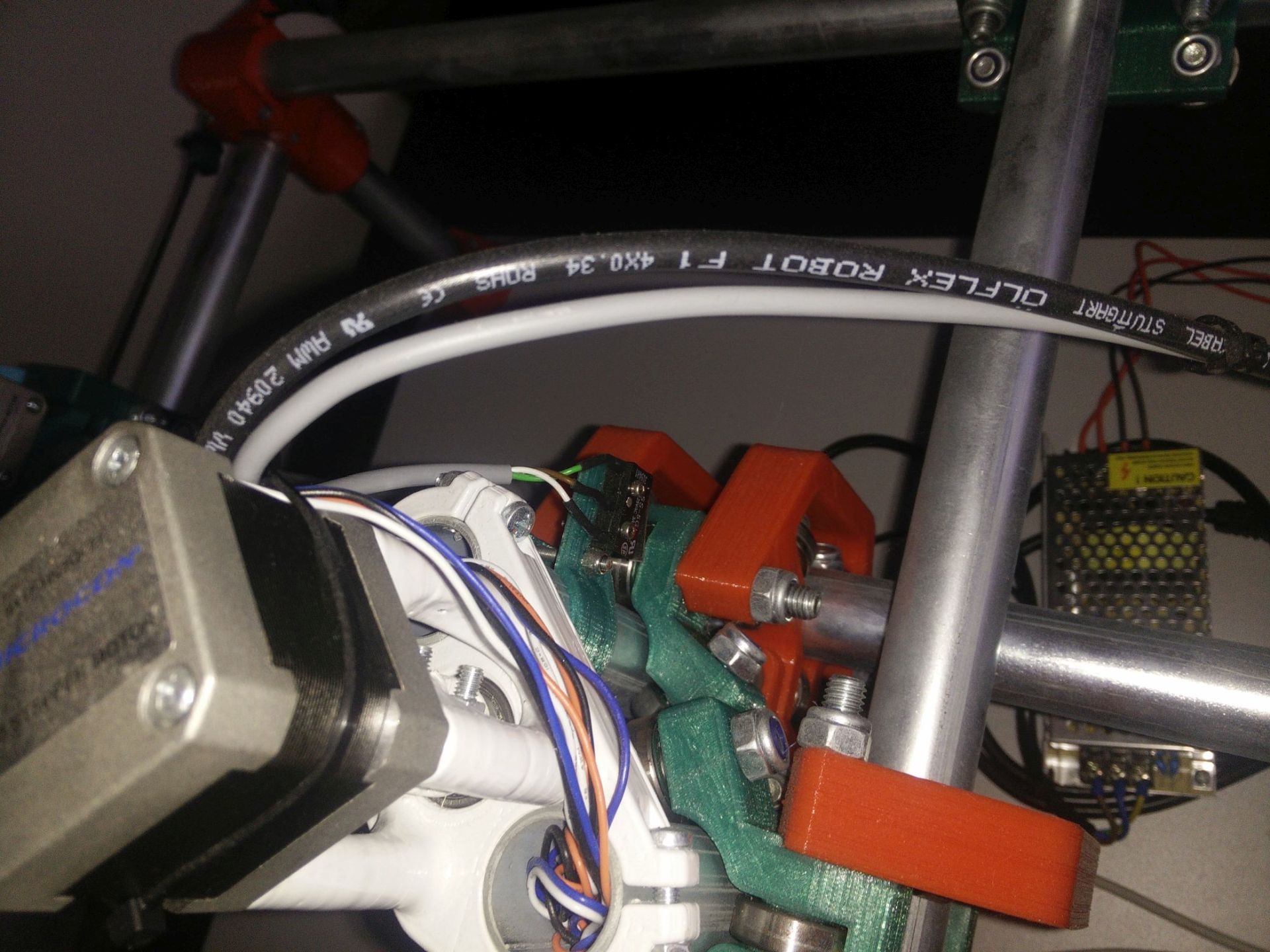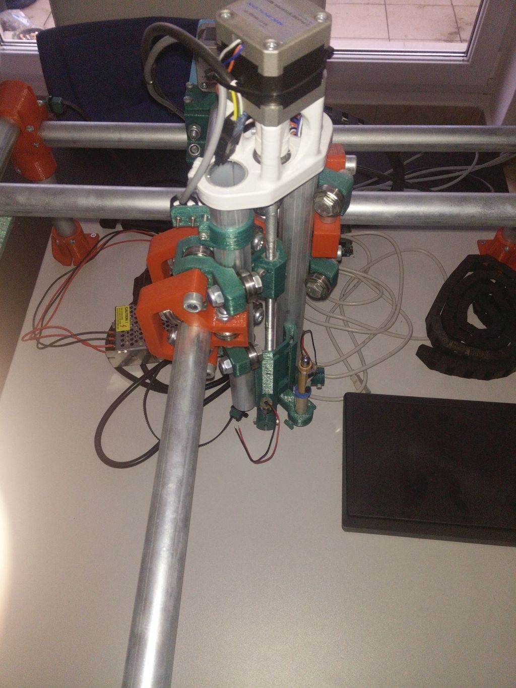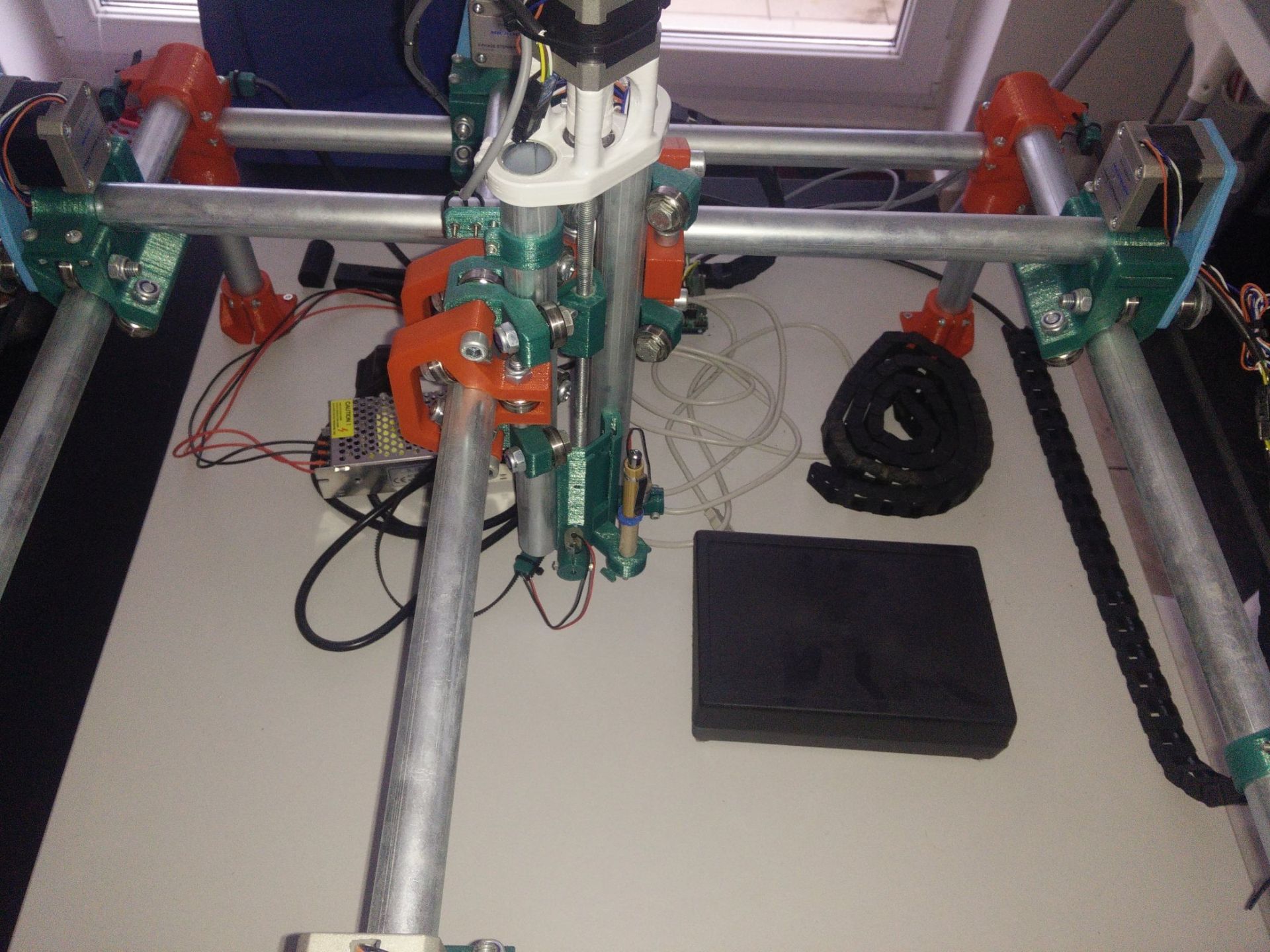 Deska 70x70cm lamino ohraněno abs lištou. Trubky 25mm z oceli následně pozinkované. Motory Microcon SX17-1005QCEF. Kabely teflonové ohybem nezničitelné OLFLEX ROBOT vedené v energořetězech. Zdroj 12V - 5A. Ramps1.4 s 32 krokovými drivery DRV8825. Ložiska 608 2Z vyrobené v České republice. Univerzální držák. Připravena krabice pro arduino, ramps a display (ten jsem zatím nekoupil). Více na fotkách. Přidám ještě nějaké konektory co mi tu zůstali navíc. plocha pro frezovaní(tisk,laser) cca 50x50cm. Nainstalovaný firmware Repetier.