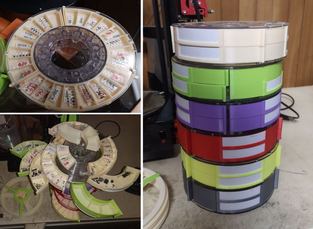 prepážky riešené ako vyberacie vložky, dole vystreďovacie krúžky pre ukladanie cievok na seba a šablóna na vŕtanie dier