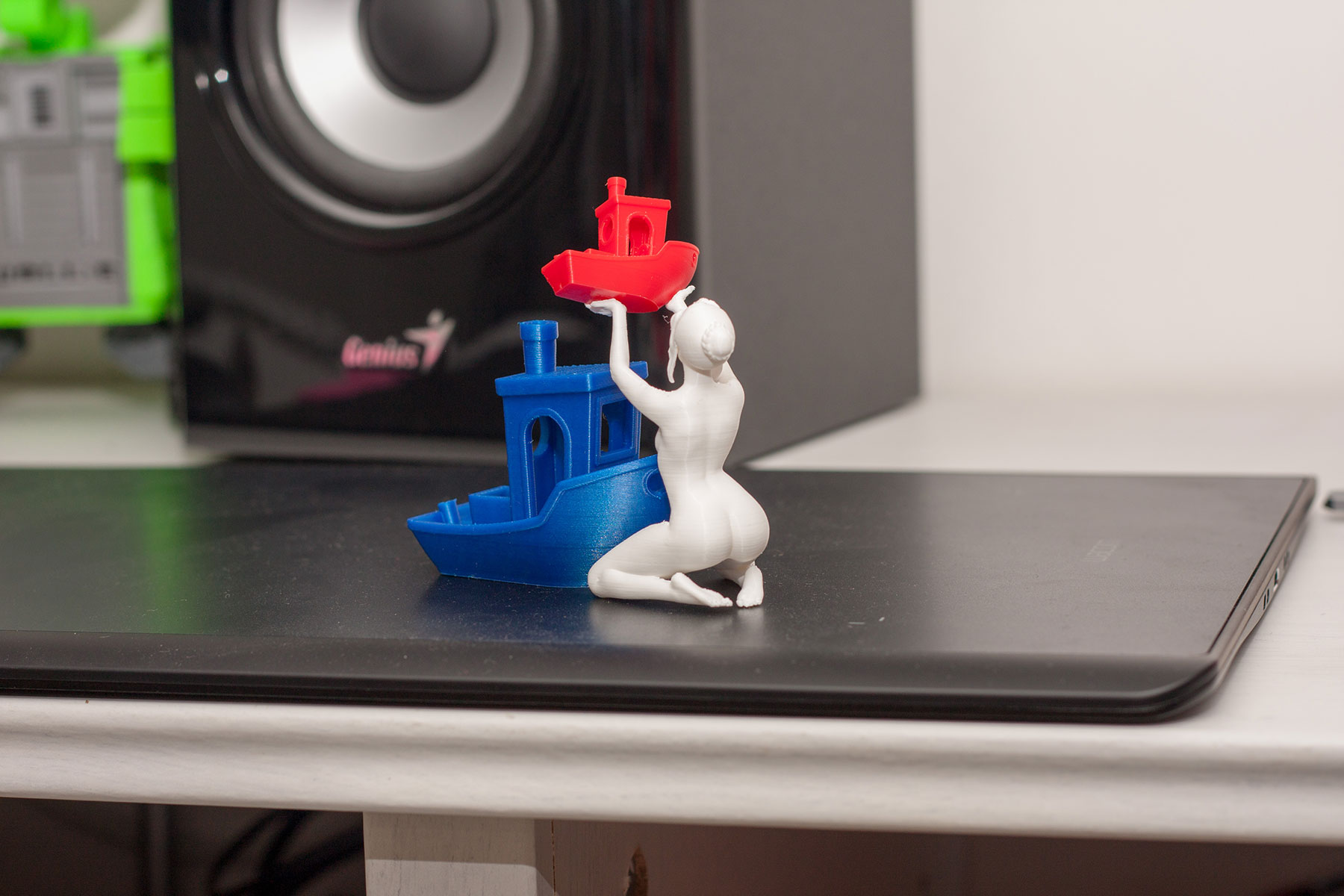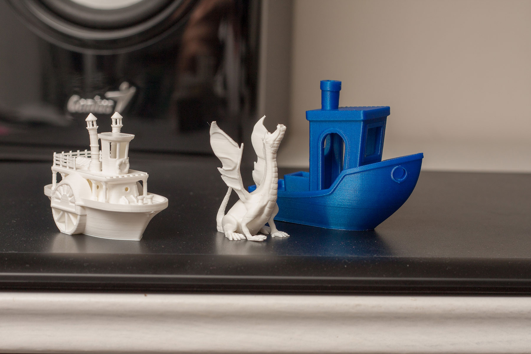 Jsou totiž relativně malé, relativně rychlé k tisku, docela univerzální, a mají různé detaily různých charakterů - převisy, mosty, malé ojedinělé objekty (kroužek u Marvina, komín u loďky - obě jsou to věci které se mohou blbě chladit a pak špatně tisknout)