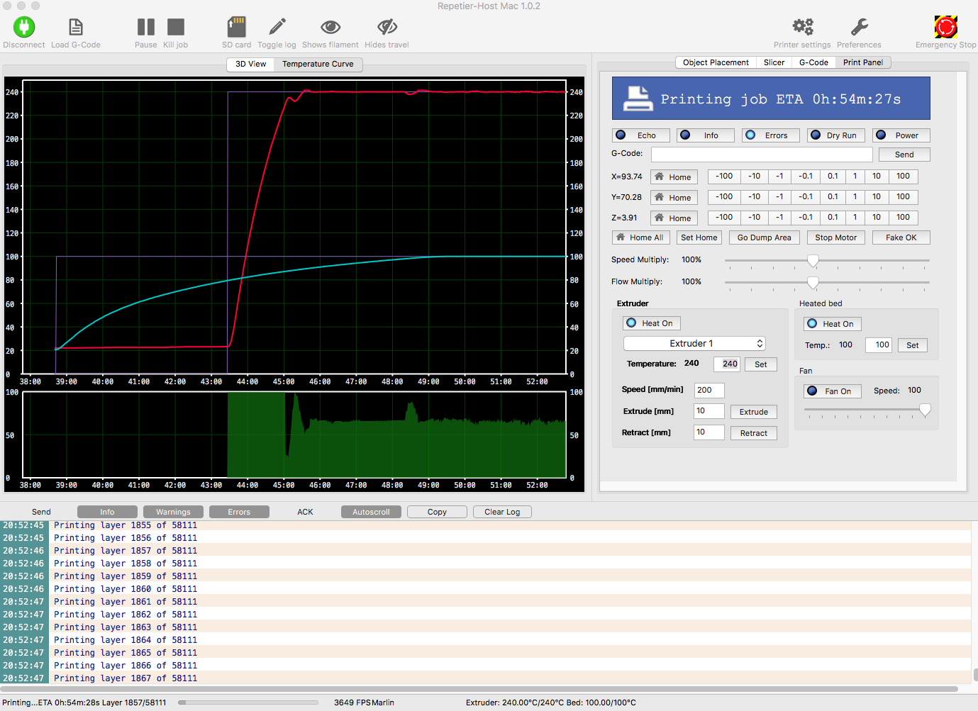 Účinnost PID regulace je vidět na přiloženém otisku obrazovky. Jemné zakolísíní na 48:30 je způsobeno ručním zavedením filamentu, který HE trochu ochladil.