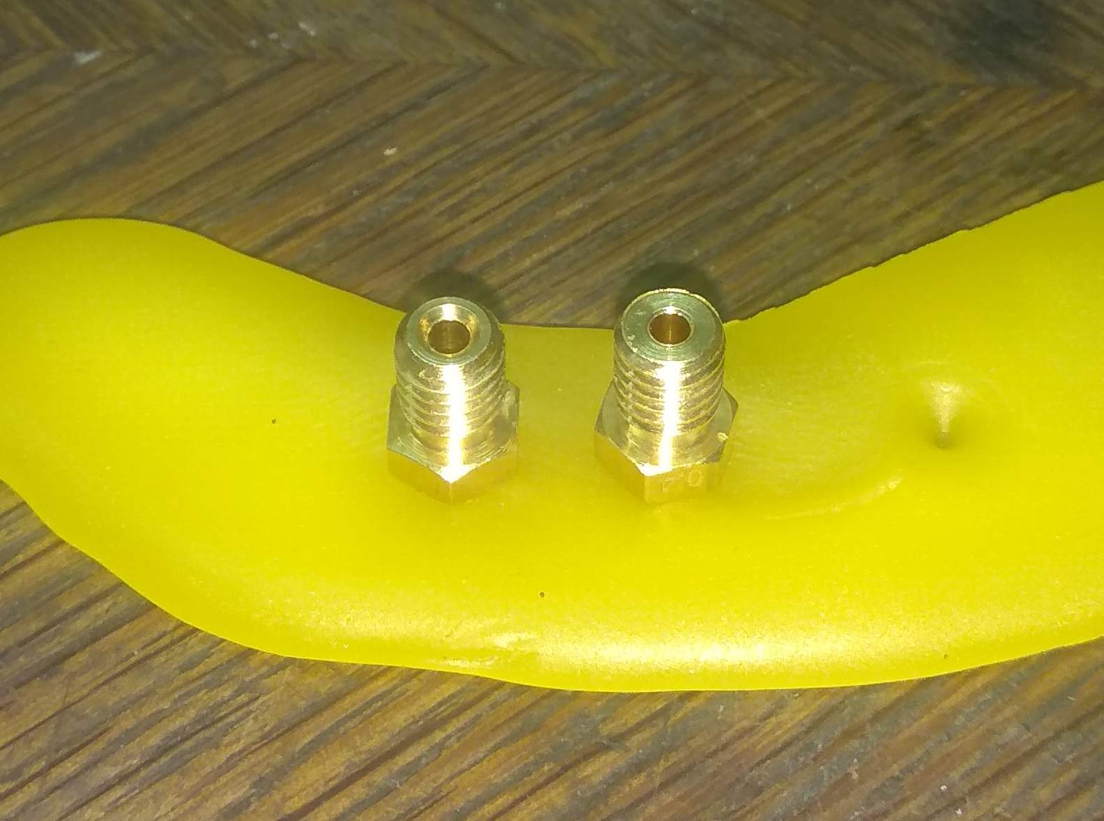 Trysky z Číny vyhazuji a vždy po čase sahnu po jiné.Takže došlo na jiný 100 ks balíček.Tam je to pitomé zkosení mnohem větší než u těch předešlých.A tam se také,přece jen v těchto místech měkčí filament při retracích napěchoval.Stačilo dát původní trysky.