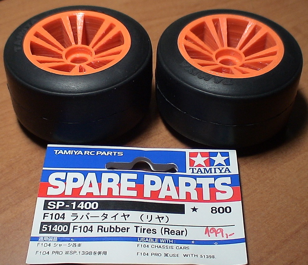 Ještě přední, pro F104 SP1399. Jsou proti zadku o 2 mm menší a o 5 mm užší. Z Thingu byly disky o 4 mm menší průměr, než jsou koupený gumy.