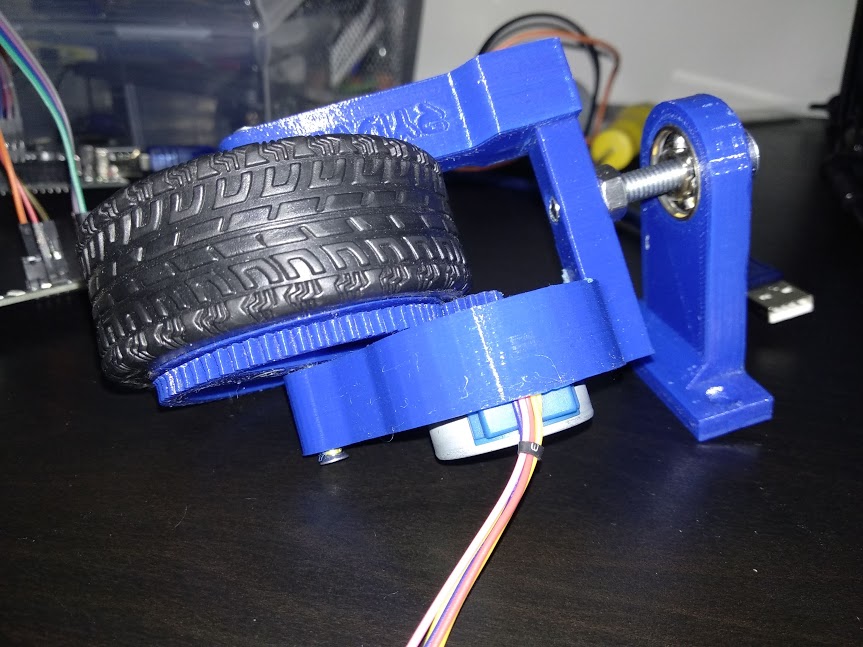 Byl v něm použit původní DC motor ze základní verze autíčka. Tato verze se neosvědčila kvůli tomu, že bylo kolo umístěné přímo na hřídeli motoru. Problém nebyl v přesnosti, protože osa byla na druhé straně uložena v kuličkovém ložisku, ale kolo se pro moje účely točilo příliš rychle a nemělo dostatek točivého momentu. Dalším problémem bylo zbytečně veliké uchycení na vozítko a na opak příliš vetchý rám s kolem a motorem. Nevhodné byly taktéž ozubená kola přenášející otáčení serva.
