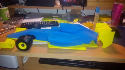 Čas jsem neměřil ale odhadem dohromady přes 30h, odhadem tak celkem 0,5 kg (celková váha vč elektroniky je 795g) Je to většina PLA Mladeč a eSun (žlutá a červená) (původně měla být celá červená ale nevyšlo mi to tak je při tisku napojená žlutá na střední části. Černé a šedivé díly jsou z ABS Fillamentum, pneumatiky Flex98A taky Fullamentum. Plus hromada M3 šroubků a matiček od MPJetu a 6 ložisek z Tobexu Motor tam je Tamyia ss540, regl. HK X-Car 45A, servo HK 9g