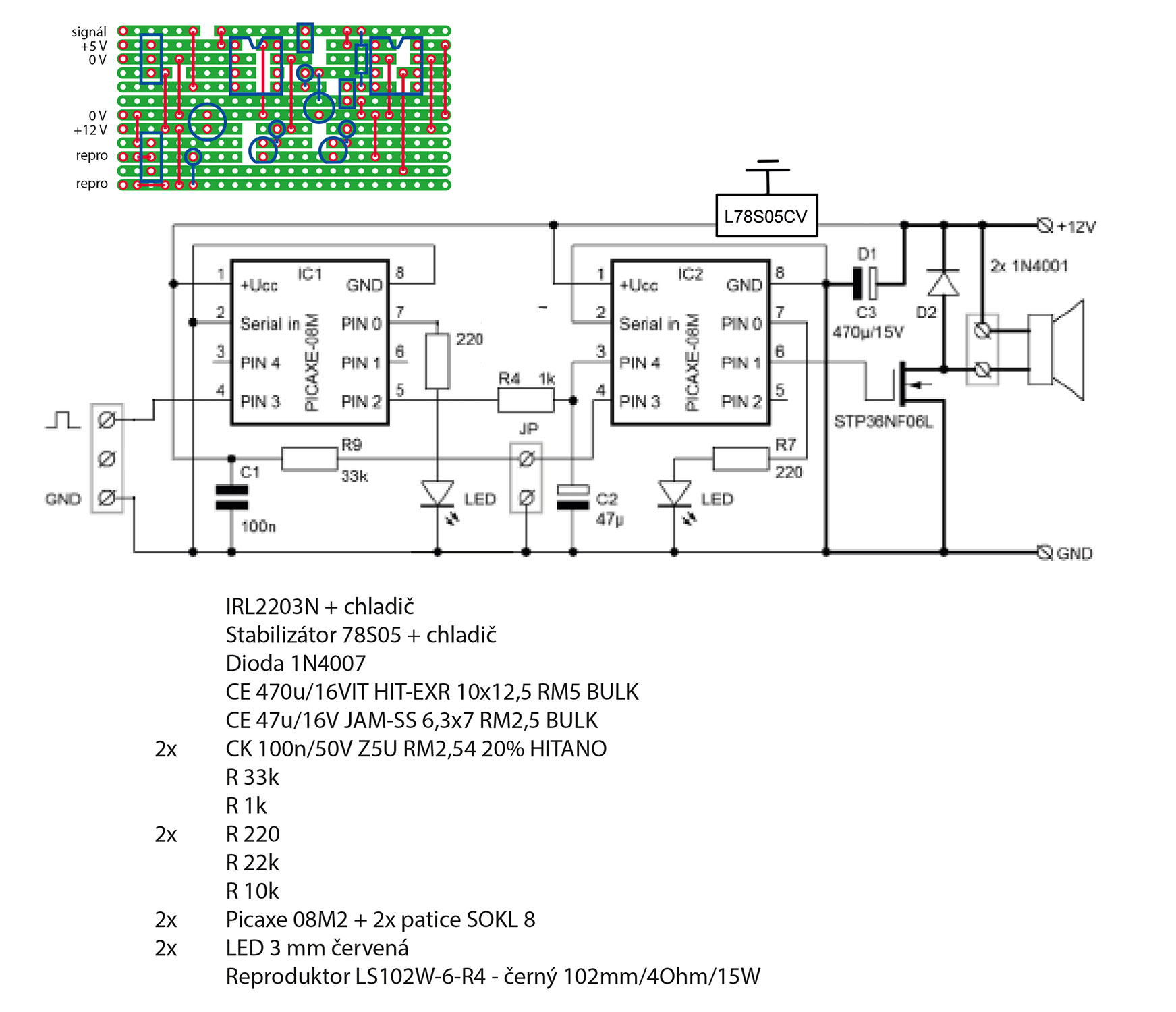Nejsem autorem zvukového modulu, jen jsem provedl pár úprav ve schématu a v programu ptro Picaxe (08M2).