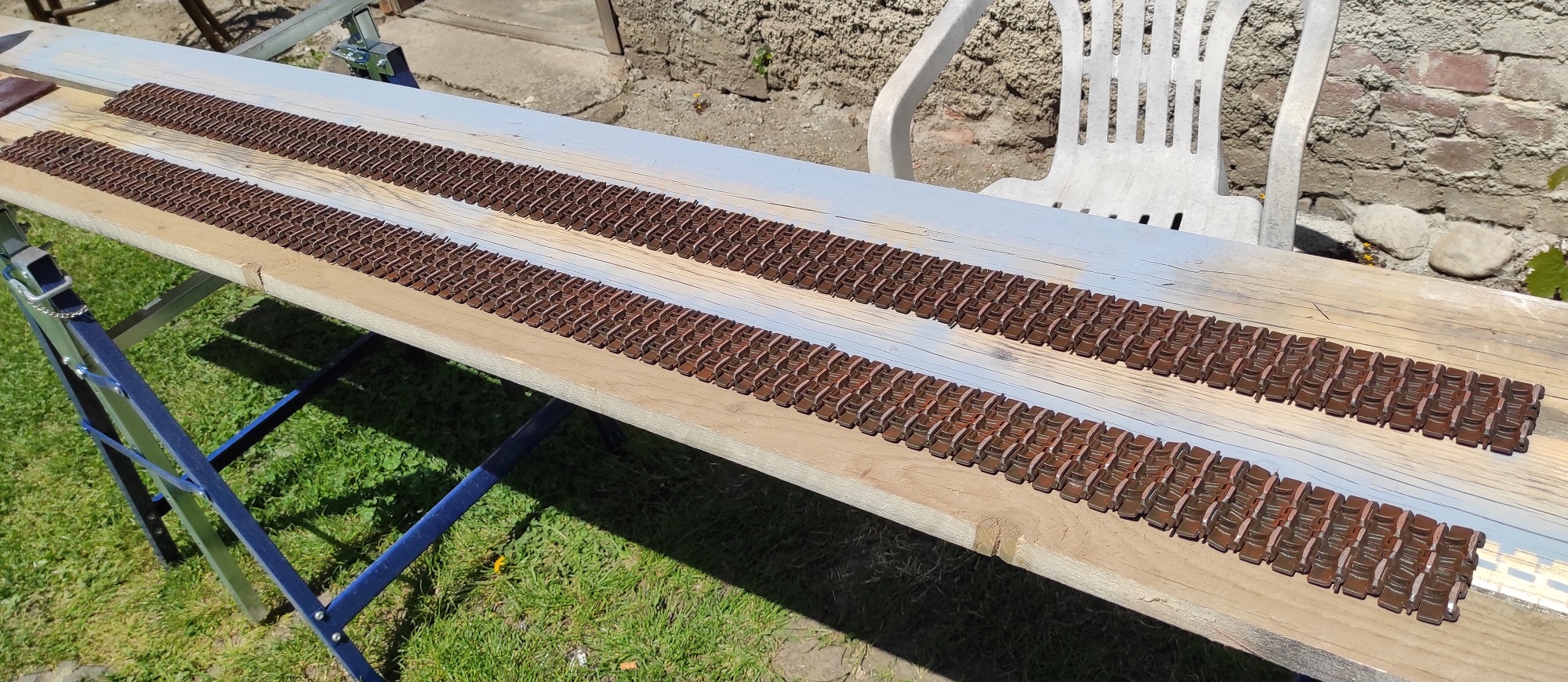Páč je léto a musí se dělat i něco jiného než hračky (povídali doma), tak jsem tisknul druhou sadu pásů, která vytížila tiskárny když jsem na kávo něměl čas. Jen jsem je tiskl na stojato. Vlákno tvoří smyčku kolem spojovacích čepů a pás je mnohem pevnější. Tentokrát je to mladečská PLA stříbrná. Jen se stříkne černým plničem, popráší "rzí" a zbytek patiny "až na kov" udělá samotná jízda.