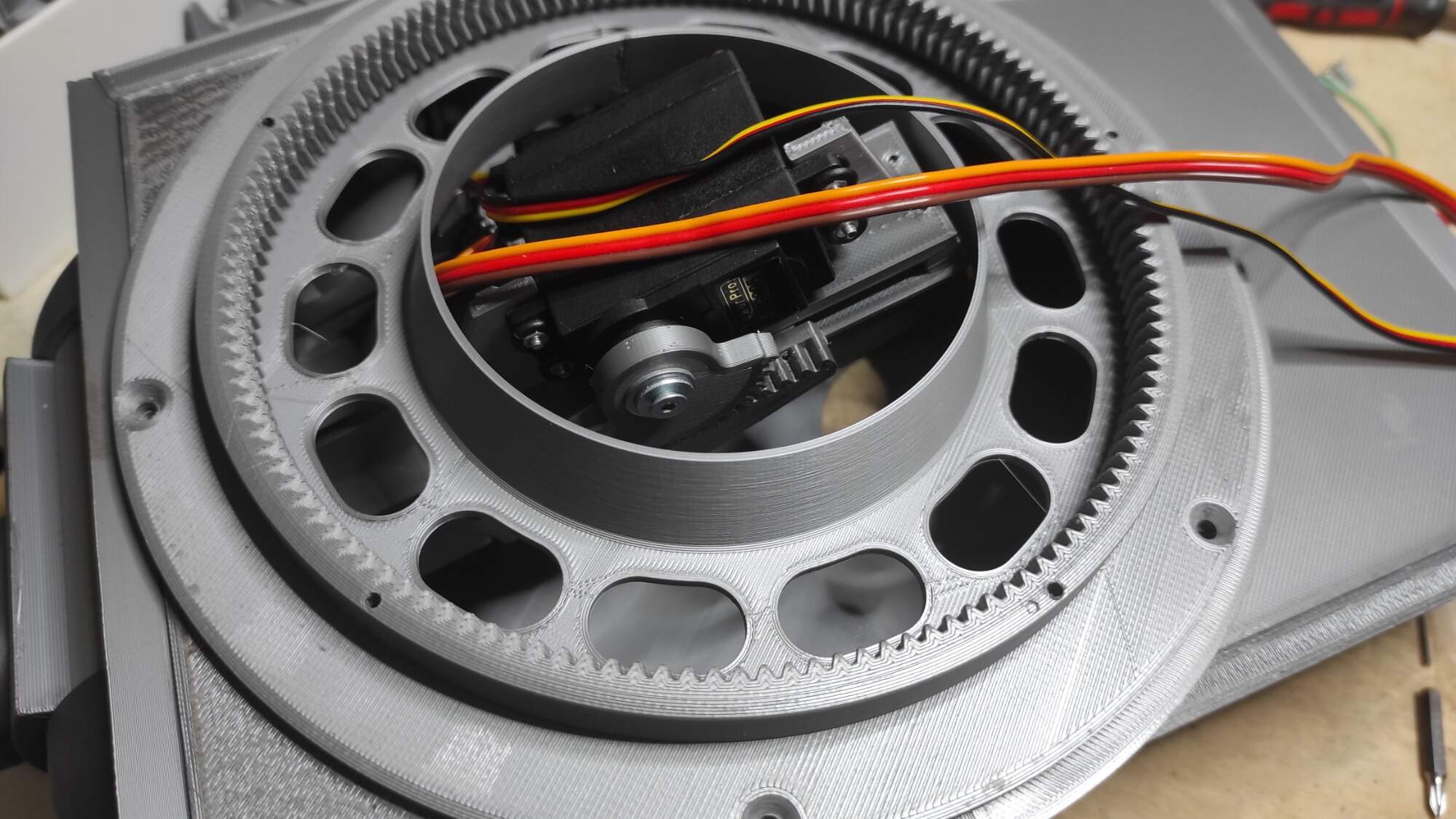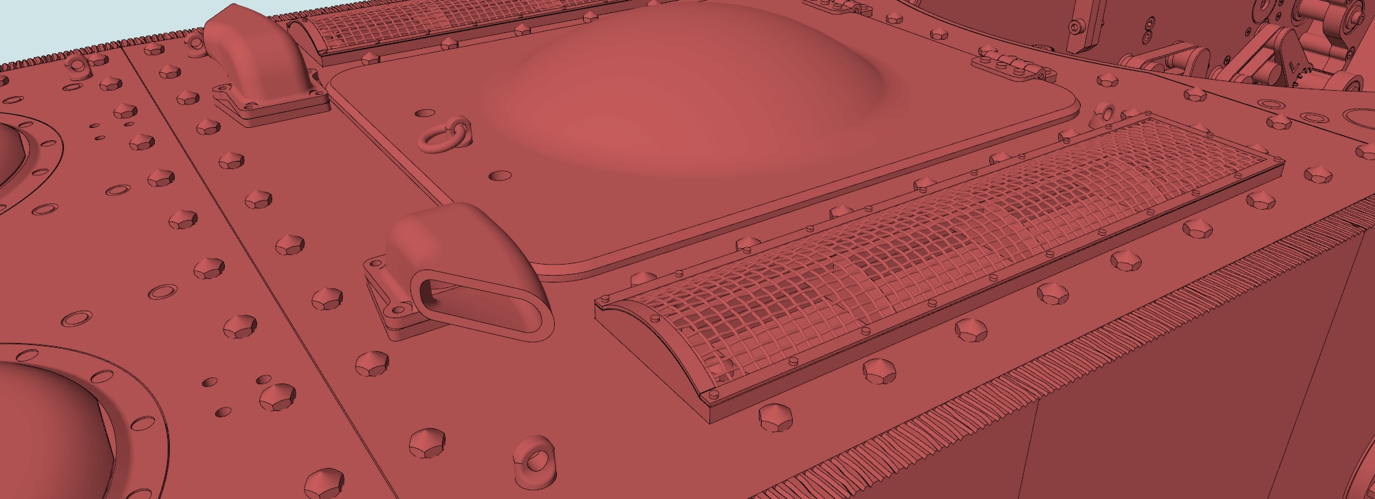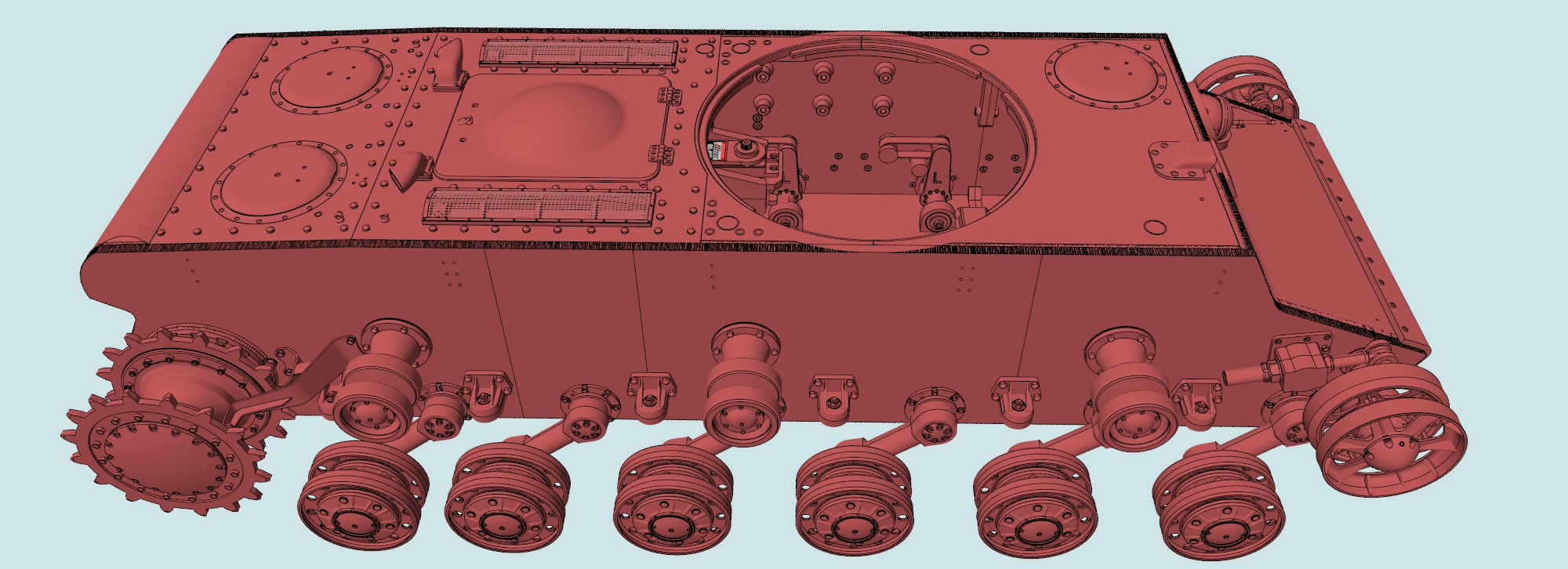 Poklop věže se otáčí s průlezem, stejně tak i periskopy. Střeliště kulometu DT-29 je pod pružinou a přišroubováno homemade šrouby M2 s hlavou bulletproof na 3ku klíč, respektive hlavu dělám podle hlavy imbusového šroubu z nejbližším rozměrem k originálu(tady šroub M4) a ten po stočení slouží jako nástrčný klíč. Bude však i celotištěná verze a pružinka se bude vkládat zevnitř věže.
