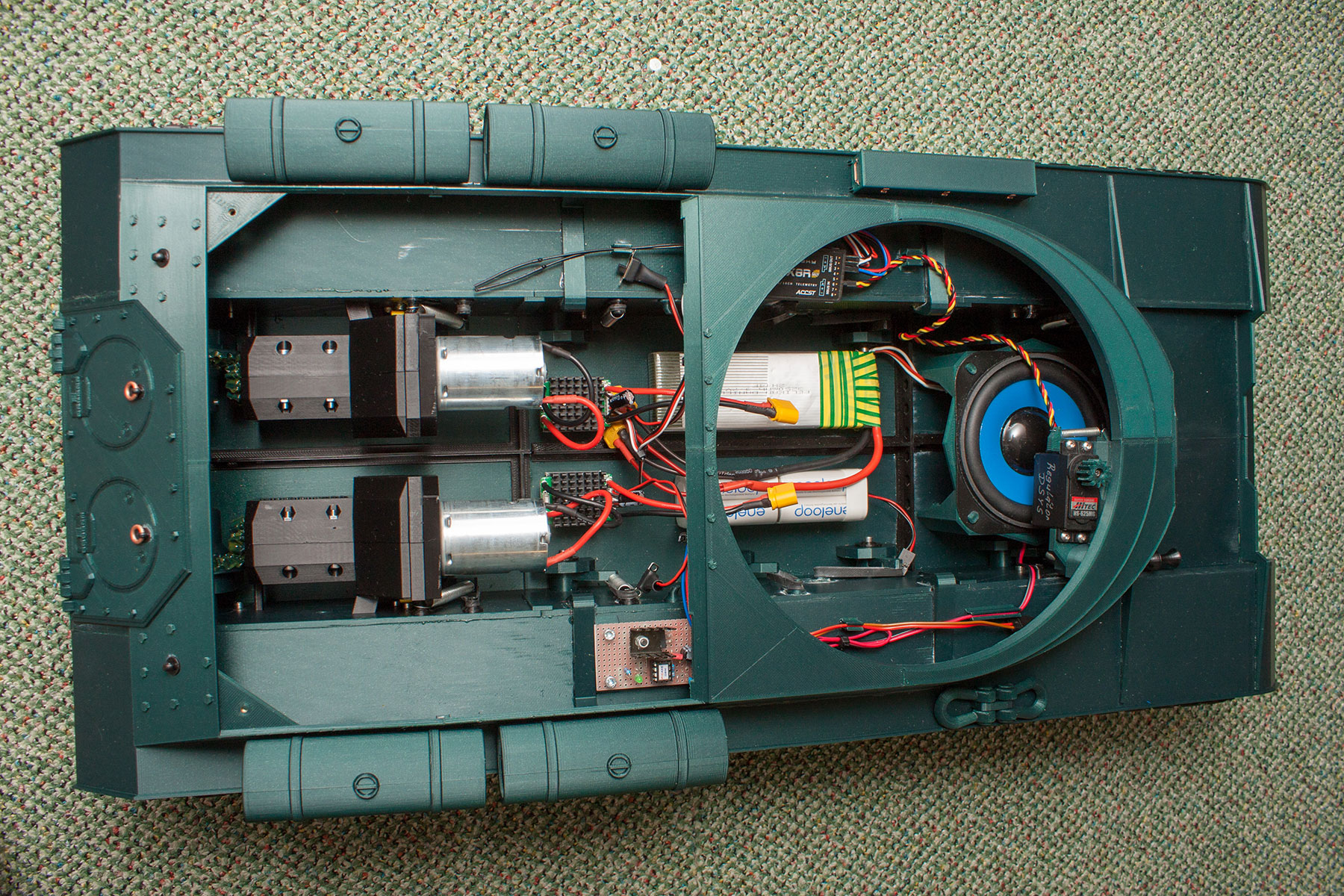 Tak jsem přepracoval poslední převod, nový je podstatně masivnější. Také jsem nastavil expo 50 % na řízení směru jízdy. Testy ježdění po bytě dopadly výborně, a to i na koberci. Pouze točení na místě jsem z vysílače vynechal (zatím), jezdí se s tím jako s autíčkem. O víkendu bude video venku, pokud nebude bláto a déšť...