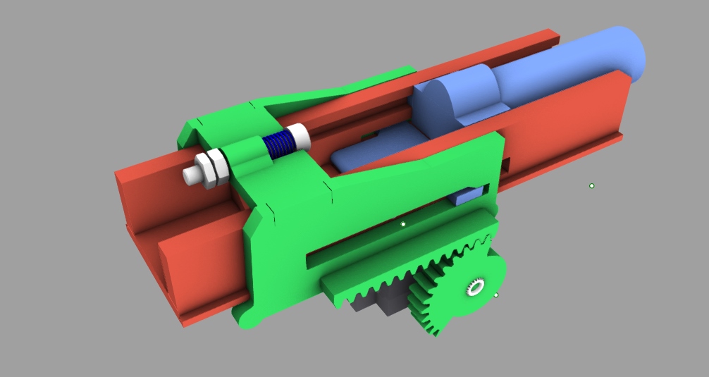 Tak jsem zbastlil zákluz. Lafeta z verze alfa, jezdec prošel verzemi k delta. :D Používá to jen jednu dráhu serva, při které odjistí lauf a zároveň mu jde naproti. Zpětný pohyb je vlastně bez funkce, jen návrat do výchozího stavu.
