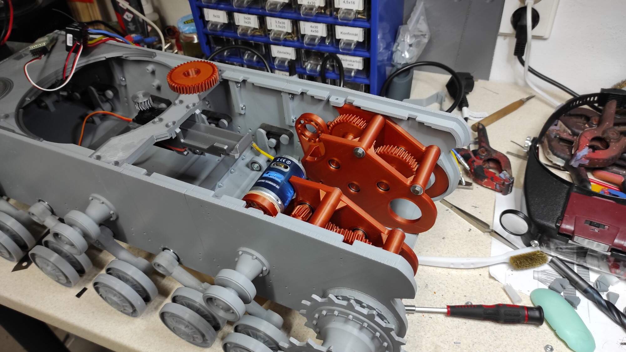 Zatím bez mazání a pásů. Převodovka chvilku řvala, ale po pár povelech vpřed-vzad se vyklidnila. Je z měděného PLA z Mladče a chodí parádně. Většinu korby jsem tiskl PLA Devil Design. Všechno fajn, ale měl jsem občas mezery mezi
