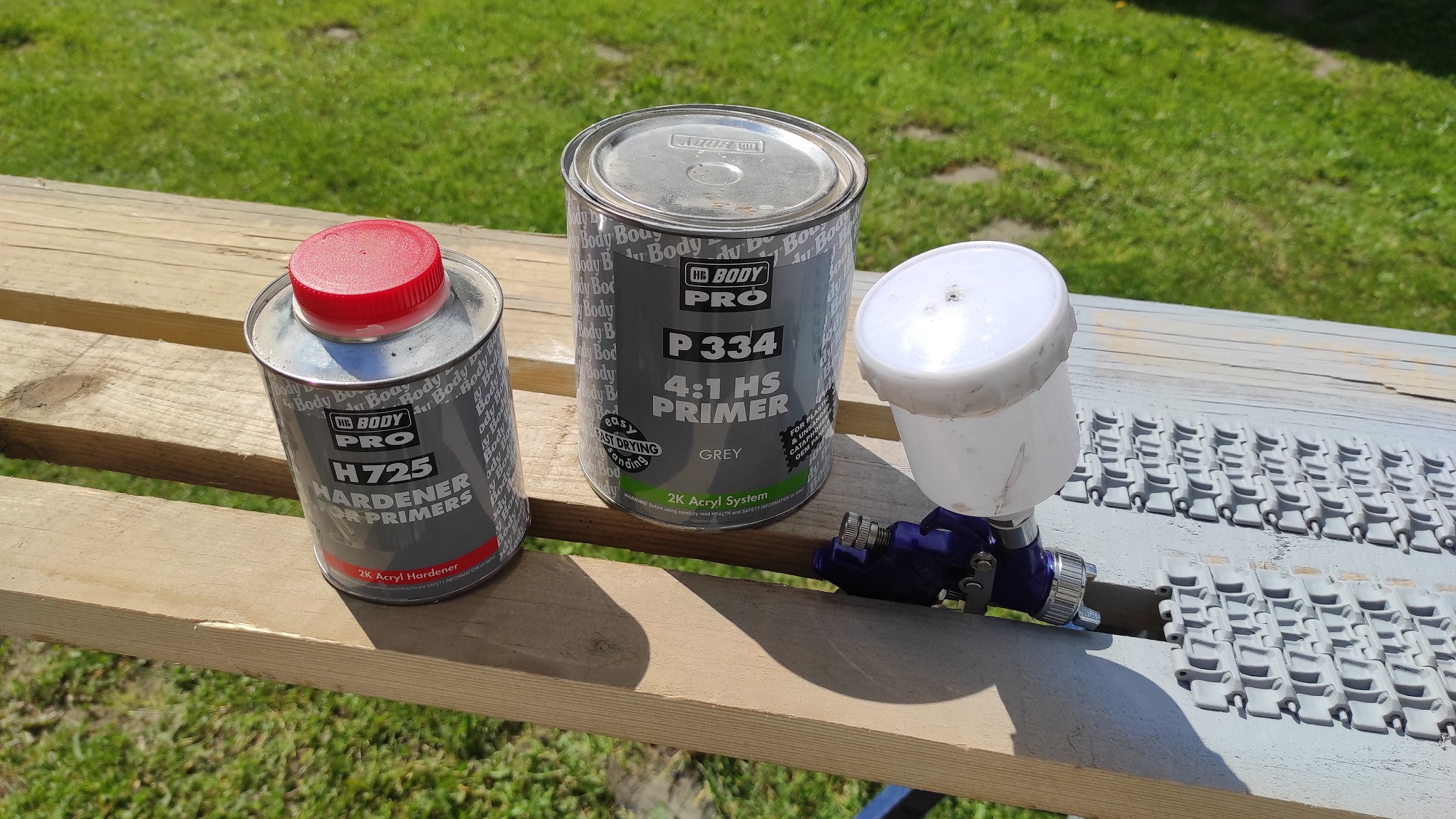 Po krátkém proschnutí normálním tlakem přestříknu tenkou vrstvou na sjednocení. A mám základ na barvení. Vypadá to "odlitkově" a já jsem spokojen. Výhoda je, že jsem to PETGéčko nemusel brousit. Jen chybička...normálně se snažím stříkat brzo ráno, než začne foukat a poletovat vzduchem kde co. Dnes jsem začal později a samosebou se dostavil trest v podobě větru. Ale kartáč to po úplném proschnutí poléčí. I z pískováním to trvalo 2 hoďky, no nekupte to :lol: