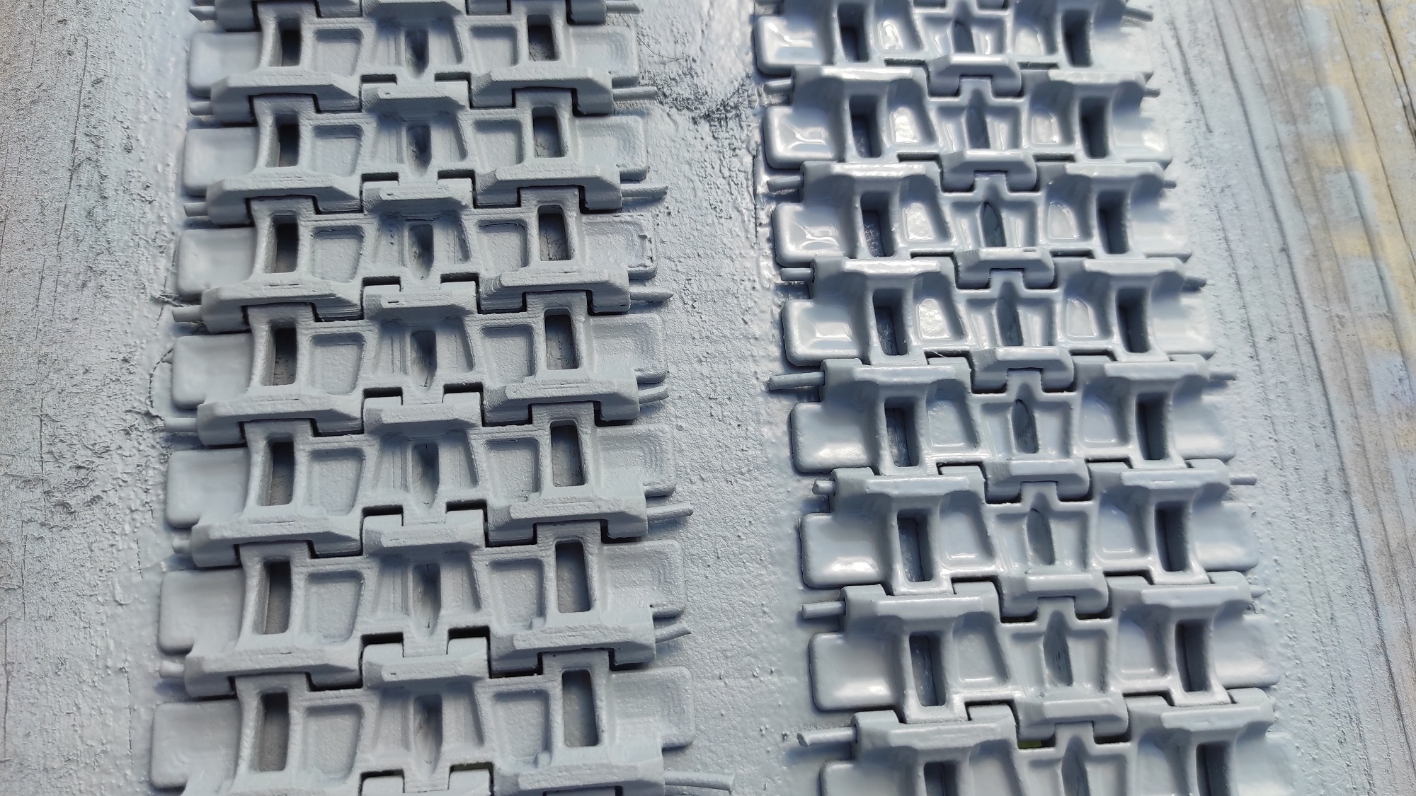 Protože mám slušnou krabici testovacích výtisků, prubnul jsem tmelení. Zabrousím povrch papírem400. Nijak moc, jen takové sjednocení. Používám dvousložkový body plnič, nedávám ředidlo. Větší plochy stříknu, je to taková hutná krupice, perfektně zalije stopy tisku a dobře se brousí. Sváry maskuju páskou. Menší plochy tupuju houbou, výsledek je podobný, jen nemusím maskovat detaily. Při větší vrstvě plniče, dokud je mokrý se pak nechá zaschlým starým štětcem napodobit (natupovat) struktura plechu z válečné výroby. Sváry přetřu štětcem reveláckým hliníkem a pak RAL 6003 nástřik.