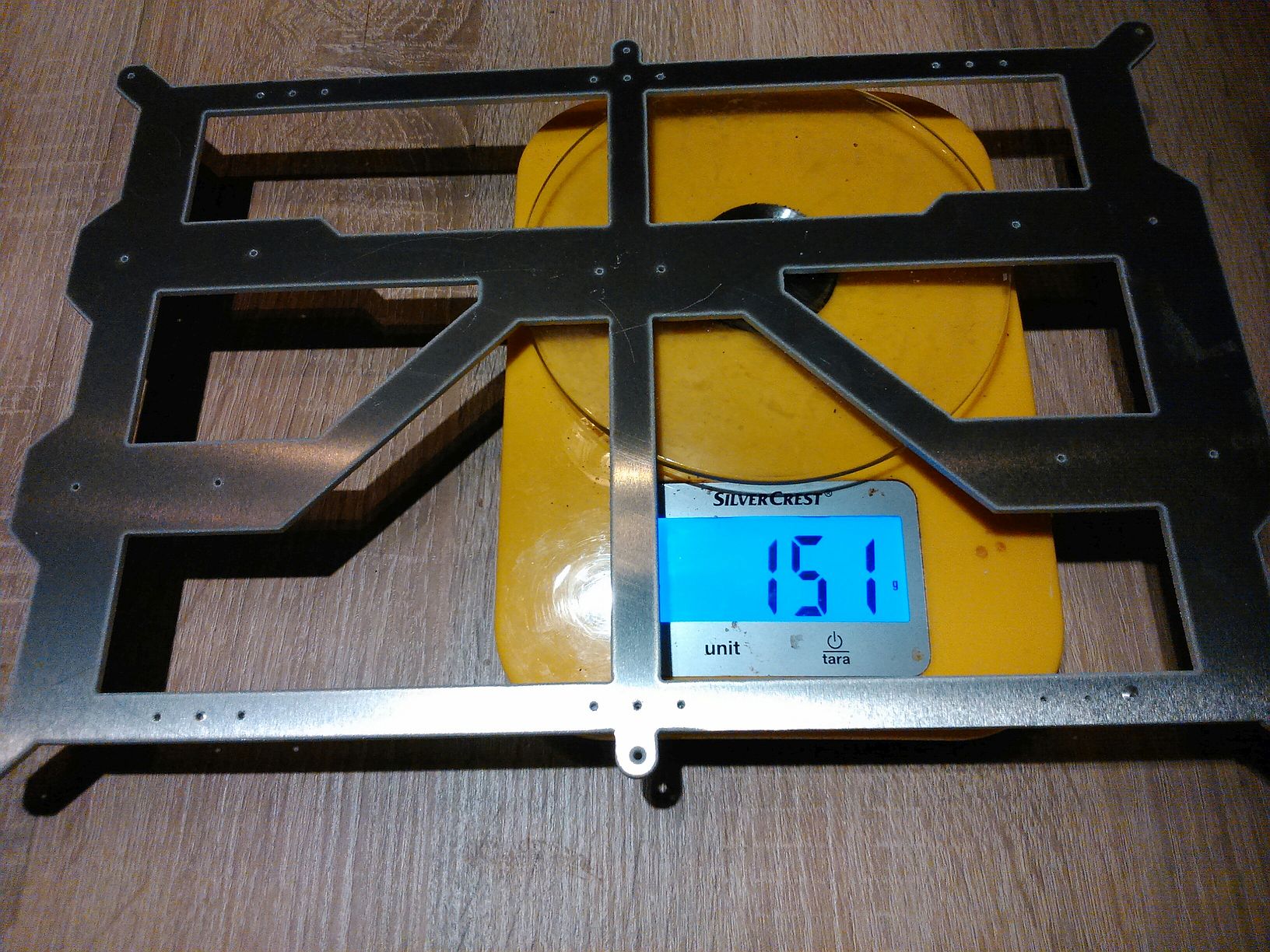 Bed váží 367 g a vozík Y 151 (super). Teď, když jsem to měl v ruce, tak bych ty nejužší místa udělal asi o 1/2 širší, ale je to jenom takový pocit. Pak je tam několik zbytečných dírek. Naopak chybí díry pro protažení a upevnění kabeláže - nevím kde se to ztratilo. Cena vozíku cca 800,- a bed 2× 500,- Kč (bedy jsem chtěl 2 ks).