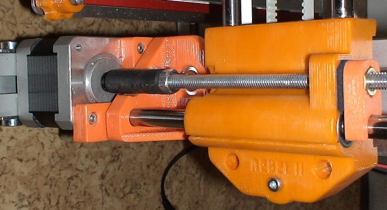 To černý ve vymezení vůle matek Z je 3 mm neoprén, co se z něj šijou obleky na vodu. Smáčknutý je asi na polovinu a přilepený pouze k tomu hornímu držáku matice aby se dala vhodným natočením matky v držáku nastavit nulová vůle matky Z.