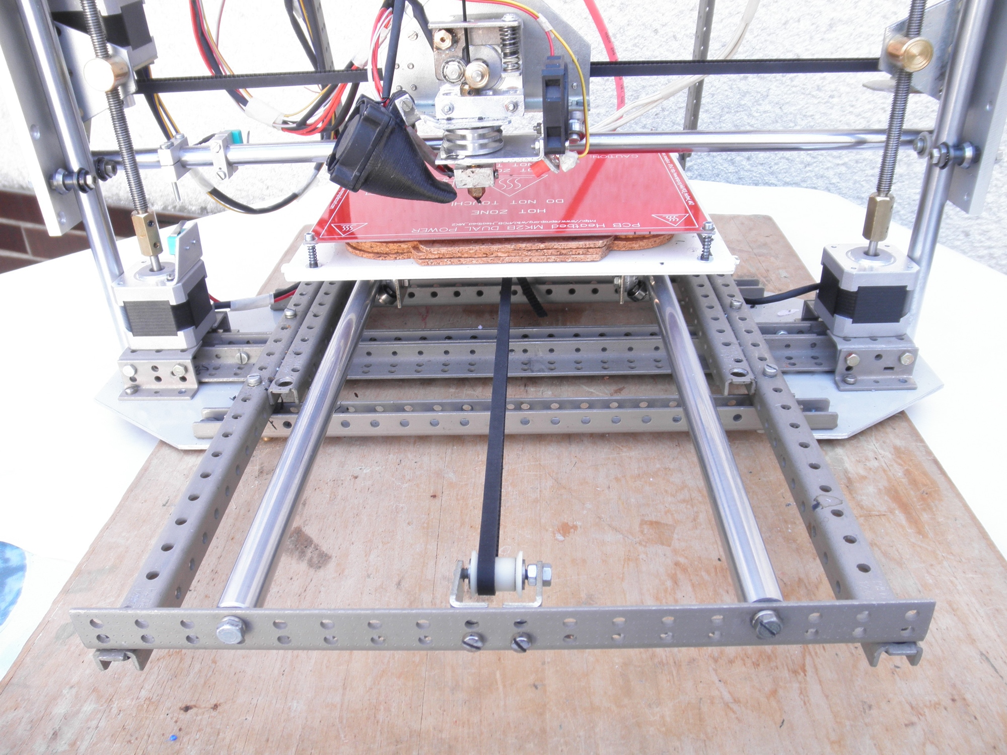 Tiskárnu jsem stavěl metodou „co dům dá“. Za léta bastlení jsem nasbíral dost materiálu, který jsem chtěl někdy využít. Zde se mi naskytla vhodná příležitost. Nosnou konstrukci tvoří profily ze stavebnice, kterou používala nějaká pražská Tesla k stavbě skříní na měřicí přístroje. Vypadají jako díly z Merkura, jsou však poněkud mohutnější a na každém je vyraženo PATENT 124337. Vodící kalené kruhové tyče pocházejí z 8 jehličkové tiskárny Zbrojovky Vyškov. Jsou sice poněkud silnější (14) a delší, ale mají na obou koncích závit. Pohyb dílů mám pomocí rolniček, část je zase z jehličkové tiskárny, další z kuličkových ložisek.