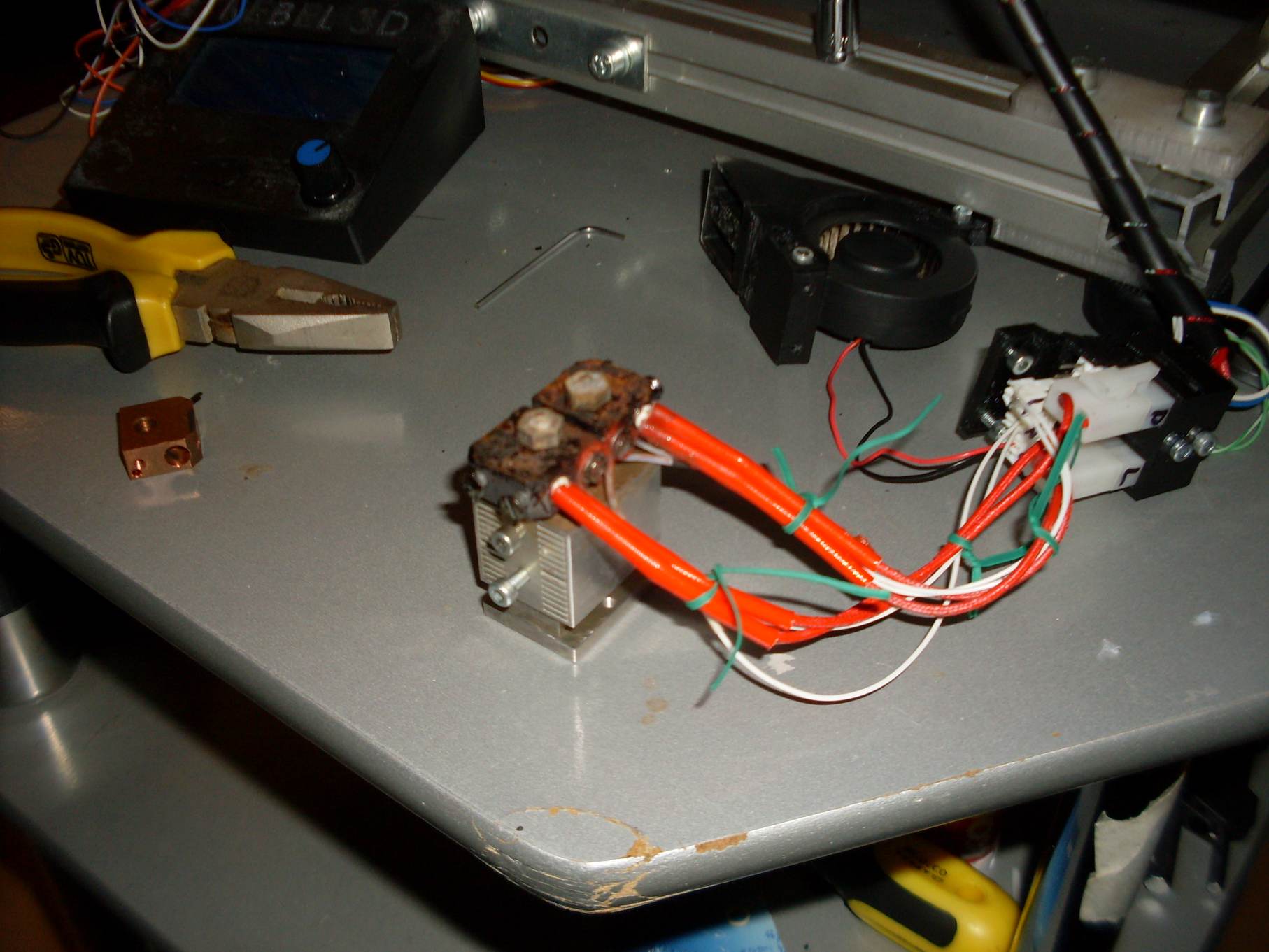 Chcel som vyrobiť niečo, čo bude zvládať 2 farby, neukúsne mi vela z pracovného priestoru, bude sa dať jednoducho meniť HE a nebude fúkať na podložku od chladiča.zatial mám osadenú len jednu hlavu lebo nemám dokončené heatbloky a aj tak mám len čierne filamenty