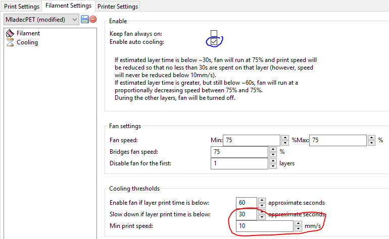 Píšeš, že používáš Slicer. Jdi do jeho nastavení, na kartu Filament Settings a vlevo na panelu klepni na Cooling. Zatrhni si Enable autocooling. Funguje to, i když nemáš ventilátor. Zpomalí to rychlost tisku v závislosti na nastavení viz. červeně zaznačeno. Samozřejmě je dobré zárověň tisknout dva objekty naráz vzdálené od sebe na ploše.