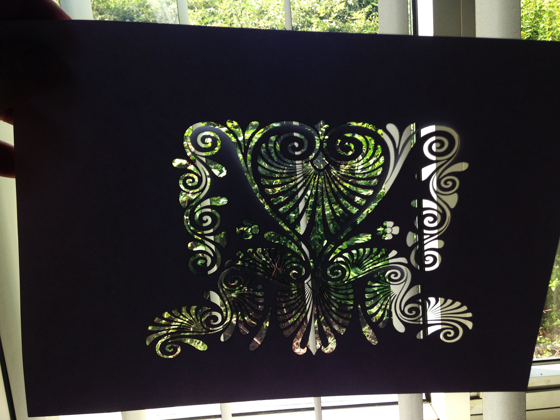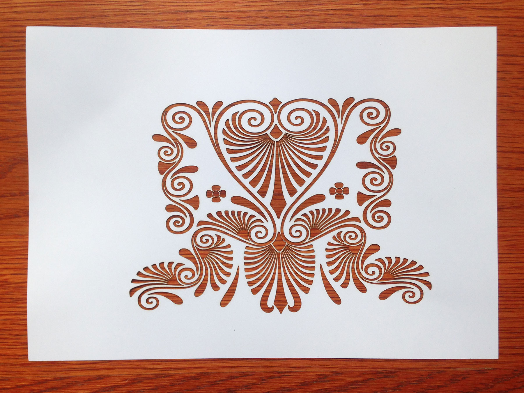 Laser 5,5 W, první test na papír 250 g, rychlost 10 mm/s (propálilo se to i do podkladové dlaždice:-).