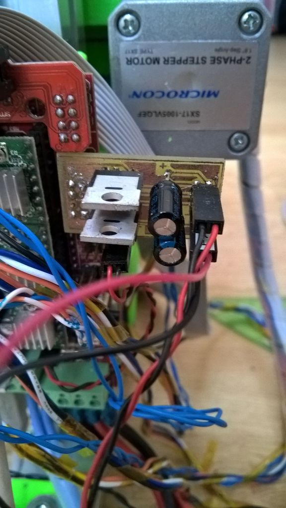 Časem se ukázalo, že je to docela těžký a teplem hotendu se to uvolňuje, tak je třeba to ještě přichytit. Zatím jsem to přichytnul vteřiňákem na držák kabeláže a ventilátoru. Je to sice prasácké, ale budu přestavovat na v.32 s výměnným extruderem, takže pak bude všechno jinak.