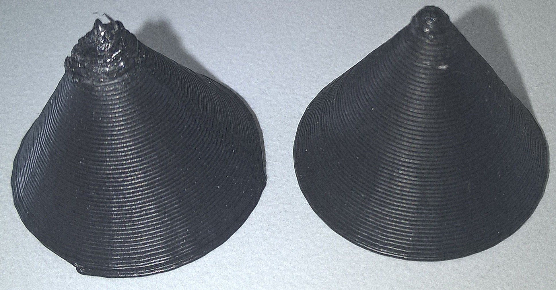 Po úspěšném pokusu o tisk krychle resp. kvádru 20x20x20(5) jsem zkusil kužel. Všechno dobrý až na špičku (jak jsem předpokládal), která se rozmázne. Přikládám obrázek.