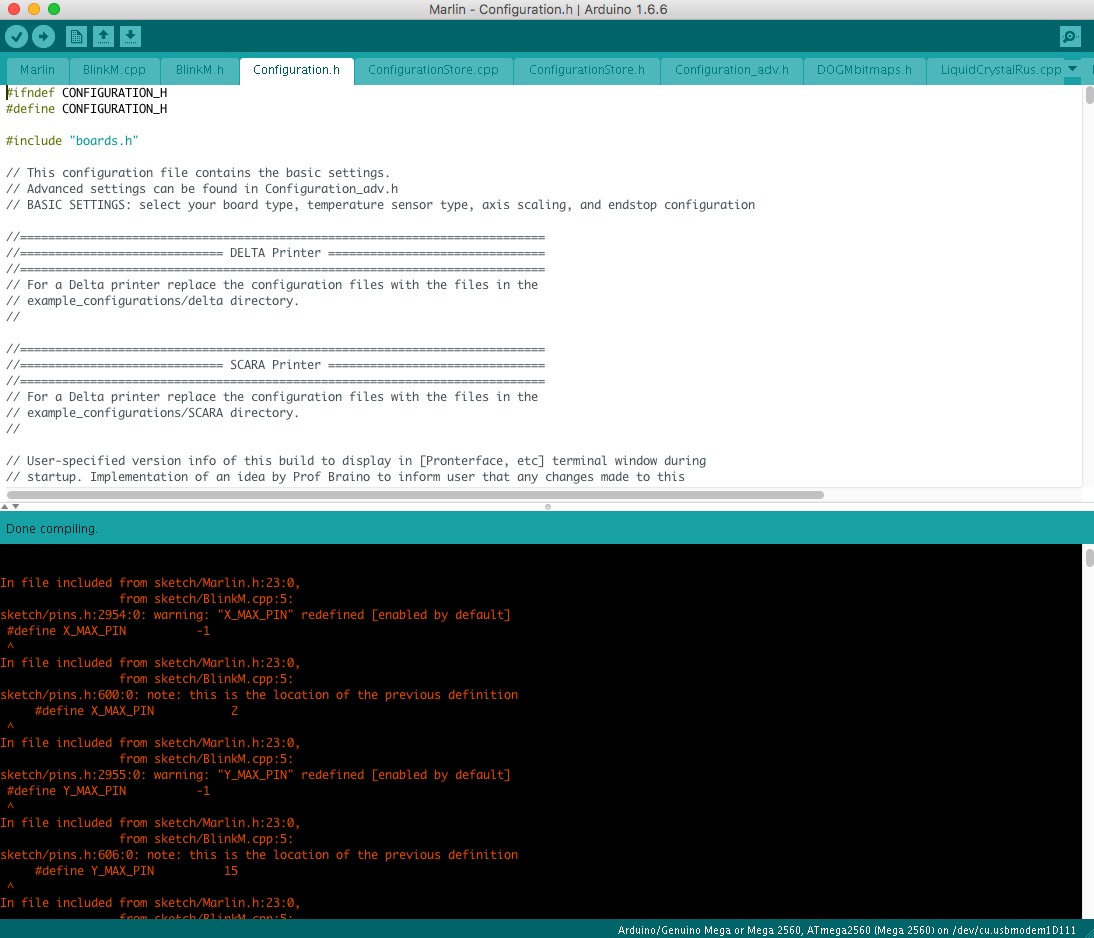 Bohužel upload se nezdařil. Zkoušel jsem jsem i nenakonfigurovanou verzi 1.0.2, ale při ověření to vysype spoustu chyb. S Arduino IDE nemám žádné zkušenoosti, jen jedinou: otevřel jsem v něm Repetier 0.92.8 od Dana a uploadnul (bez chyb), jen jsem si ho předtím přenastavil ve webkonfigurátoru pro svou tiskárnu. Je to jediný firmware, který mi nehází chyby. Dokonce nedokážu ani ověřit originál verzi 0.91 od JRC, hází také spoustu chyb.