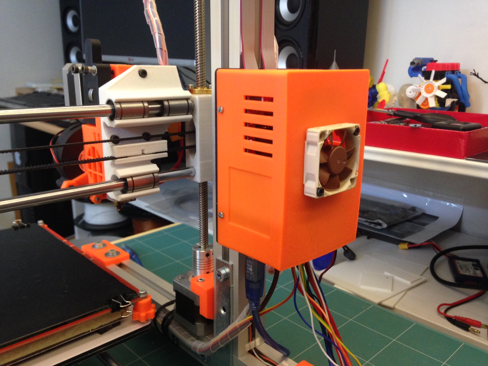 Vyrobil jsem kryt na elektroniku s ventilátorem 40x40 mm. Mám ho řízený z Marlina, takže se po ukončení tisku vypne.