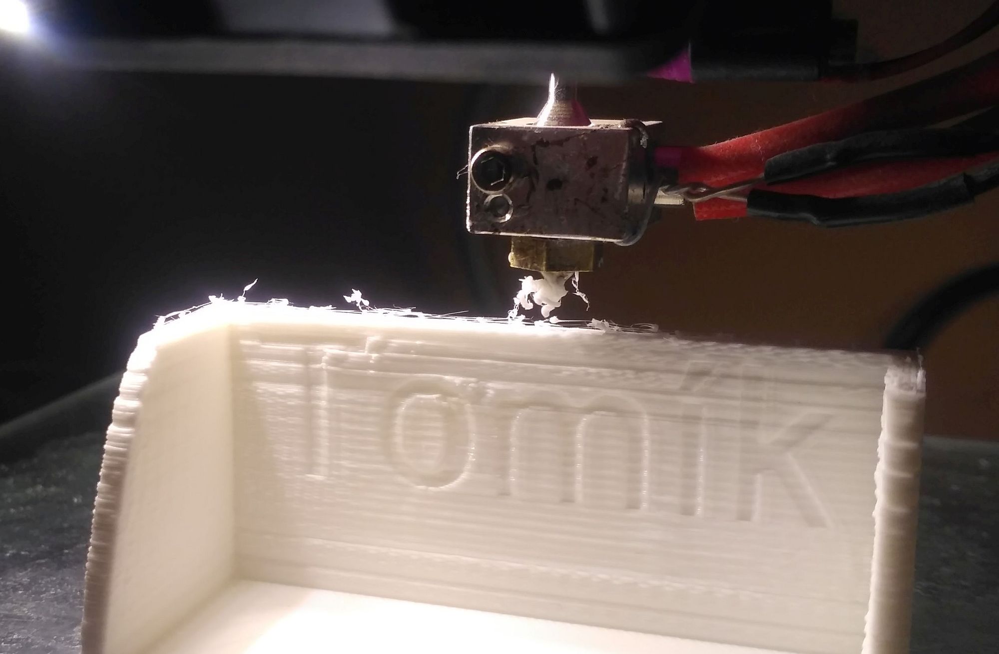 3. zmenšit délku otvoru 0,4 (příliš velká dálka může vést k občasnému ucpávání, příliš malá vade k velkému průměru vytlačeného materiálu za tryskou, což ale na druhou stranu kupodivu neovlivní příliš tisk samotný) používám k tomu u číňanu mikrovrtačku s kuželovou frézičkou.