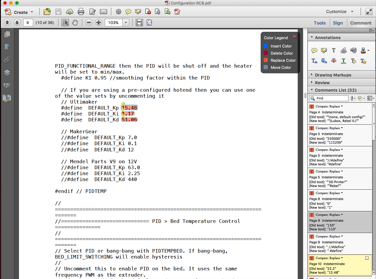 Veškeré mé změny jsou vyžnačeny korekturami, doporučuji použít progtam Adobe Acrobat a zobrazit si sloupek korektur. Nastavení mám pro Rebela II. s úpravami na dva drivery Z, dva endstopy, řízený ventilátor tisku - pin 6 přez Fan extender, ventilátor HE - pin 9 a ofuk elektroniky (driverů) - pin 11 - Fan extender.