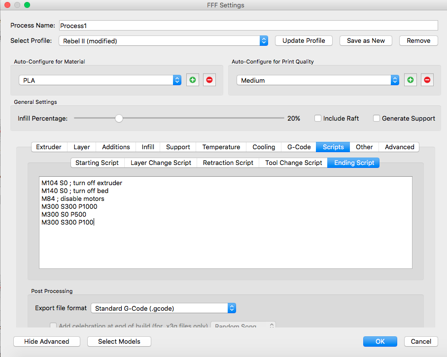 Caute, asi to uz poznate, ale na fore som to nenasiel. Chcel som, aby mi Rebel zapipal svojim nadhernym hlasitym pipakom po ukonceni tlace a v GCODE wiki som nasiel prikaz M300 syntax je M300 Sxxx Pyyyy Sxxx je frekvencia (pri piezo menici je jedno, ake cislo tam dame), napriklad S300 Pyyyy je dlzka pipania v milisekundach mne to S3D automaticky doplna na koniec celej tlace: M300 S300 P1000 M300 S000 P500 M300 S300 P1000 co sposobi dve jednosekundove zapipania oddelene 0.5s pauzou. Mozno to niekomu pomoze, ked to bude hladat
