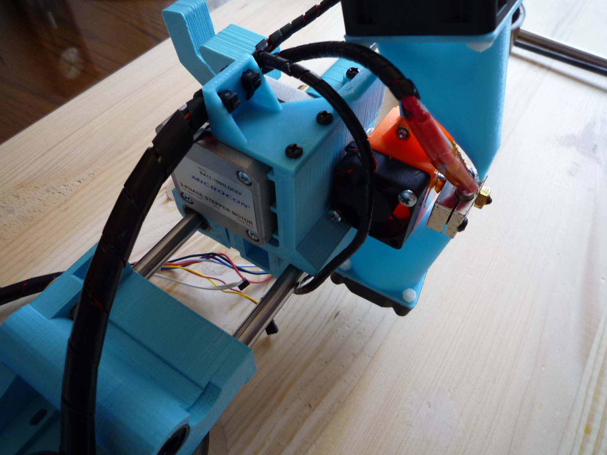 jedná se o komplet osu X vybavenou hybridním extrudérem E3D V6. Celé je to osazeno třemi ventilátory Maglev, posun s Mikrokom 1005 s mosaznou zubaticí. V hotendu je vyměněna teflonová trubička 3/2. Jinak je trubička snadno vyměnitelná. Celá sestava je na kalených tyčích s lineárními kuličkovými ložisky. Celý hotend je zapojen a osazen konektory tak, jak byl demontován Na pravém posuvu je soustružená kladka se dvěma ložisky. Osa Z je také na kalených tyčích s lineárními ložisky. Posun je také na kalených tyčích a tvrdé (žluté) šroubovice s vysoustruženými maticemi. Celá sestava byla v provozu asi půl roku a vytiskla cca 5kg materiálu. V příloze je několik ukázek a celá sestava. Prodávám za 1600.-Kč plus asi 100.-Kč poštovné. Je to cena za železo. tištěné díly přidávám grátis. Kromě hotendu je všechno původem ČR.