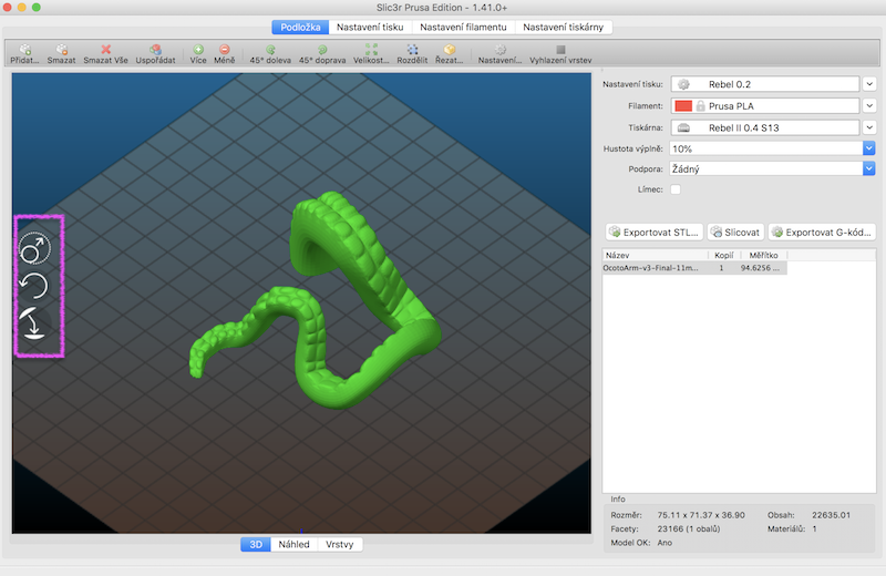 Nová verze Slic3r 1.41 má konečně dlouho očekávané umístění objektu na plochu kliknutím podobně jako Simplify3D, dále pak rotaci a úpravu velikosti myší...
