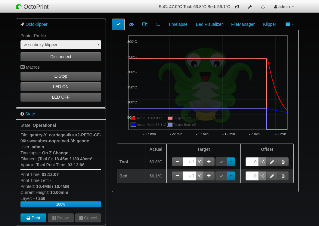 daval jsem dohromady Octoprint na Orange Pi Zero a tady jsou moje poznamky jak na to. Treba se bude nekomu hodit. Vykonostne je to velmi dobre, odhad na urovni raspberry pi 2. Spotreba - potrebuje to asi 0.5A na 5V. Pod nejakych 4.8V to obcas nenastartuje. Lepsi mit treba na 5.2V.