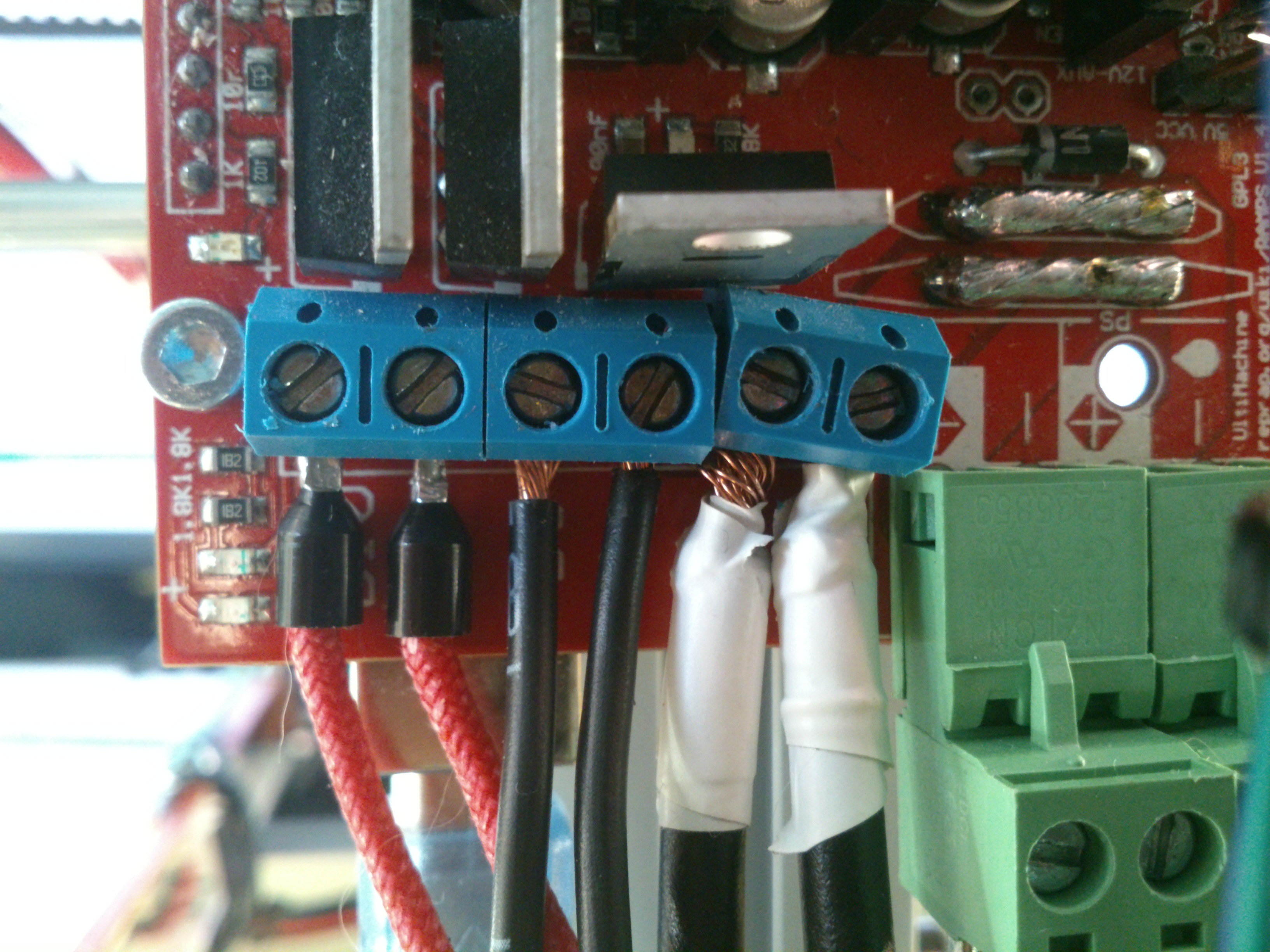 náhradní konektory stejně jako na Ramps , koupíš kdekoli v prodejně s drobnou elektronikou do 100Voltů .Dráty určitě šoupni do kabelových koncovek jak píše Luboš jinak to nedotáhneš a zase se ti to někde vyhřeje a vypálí .