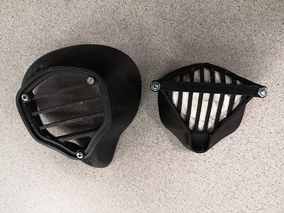 Nezapomeňte všichni na to že je to tištěno jako porézní věc - tedy netěsní a je třeba to povrchově upravit dle vašich možností ( nastříkat barvou , naleptat povrch materiálu aby se slil v jeden celek ) a nezapomeňte , že to je jednorázová záležitost . leda by jste používali jako dezinfekci něco na bázi alkoholu ( upozorňuji ,že to musíte nechat odpařit samo - neutírat !!!) a pravidelně měnit filtry i ten Hepa byť tedy za delší dobu . je třeba také onen filtr nějak utěsnit , řekněme zalepit do masky akvaristickým silikonem ,aby mezi plastem nebyla mezera . Kolem obličeje je nezbytně nutné také vše dotěsnit , třeba lepící těsnění na okna ( gumové nikoliv pryžové či molitanové )některým určitě sedne ta s menším filtrem i bez úprav je pro chlapy