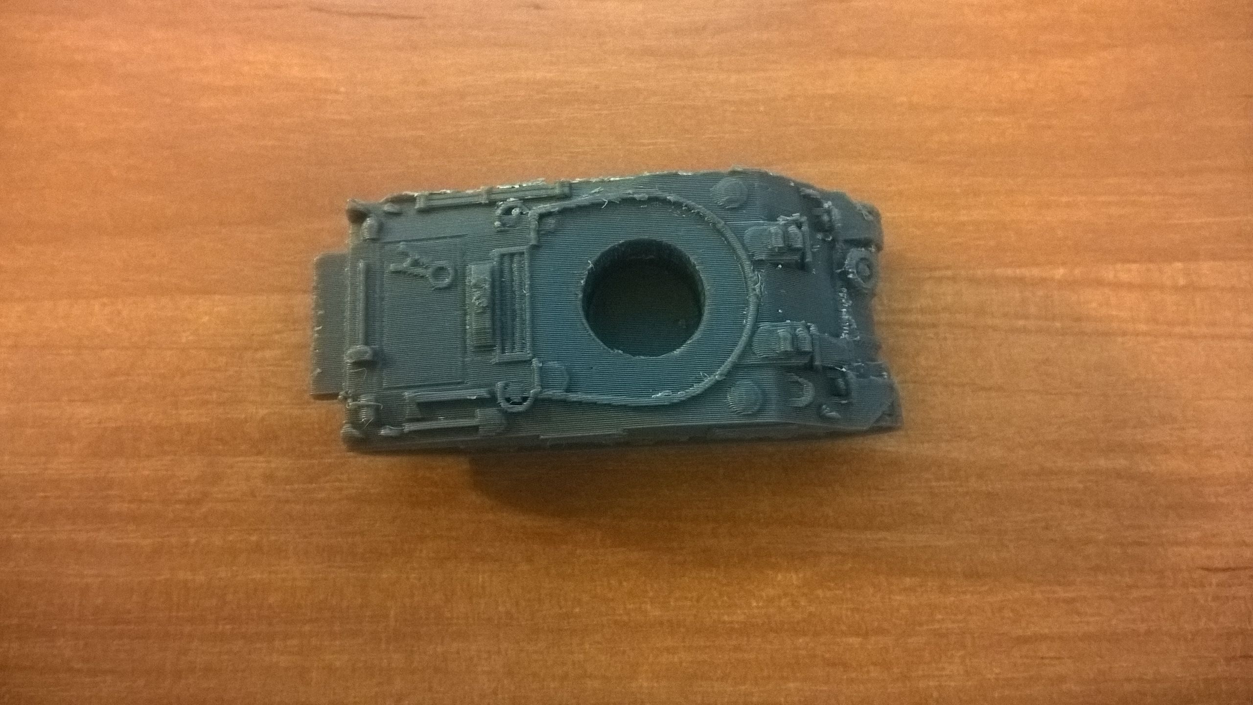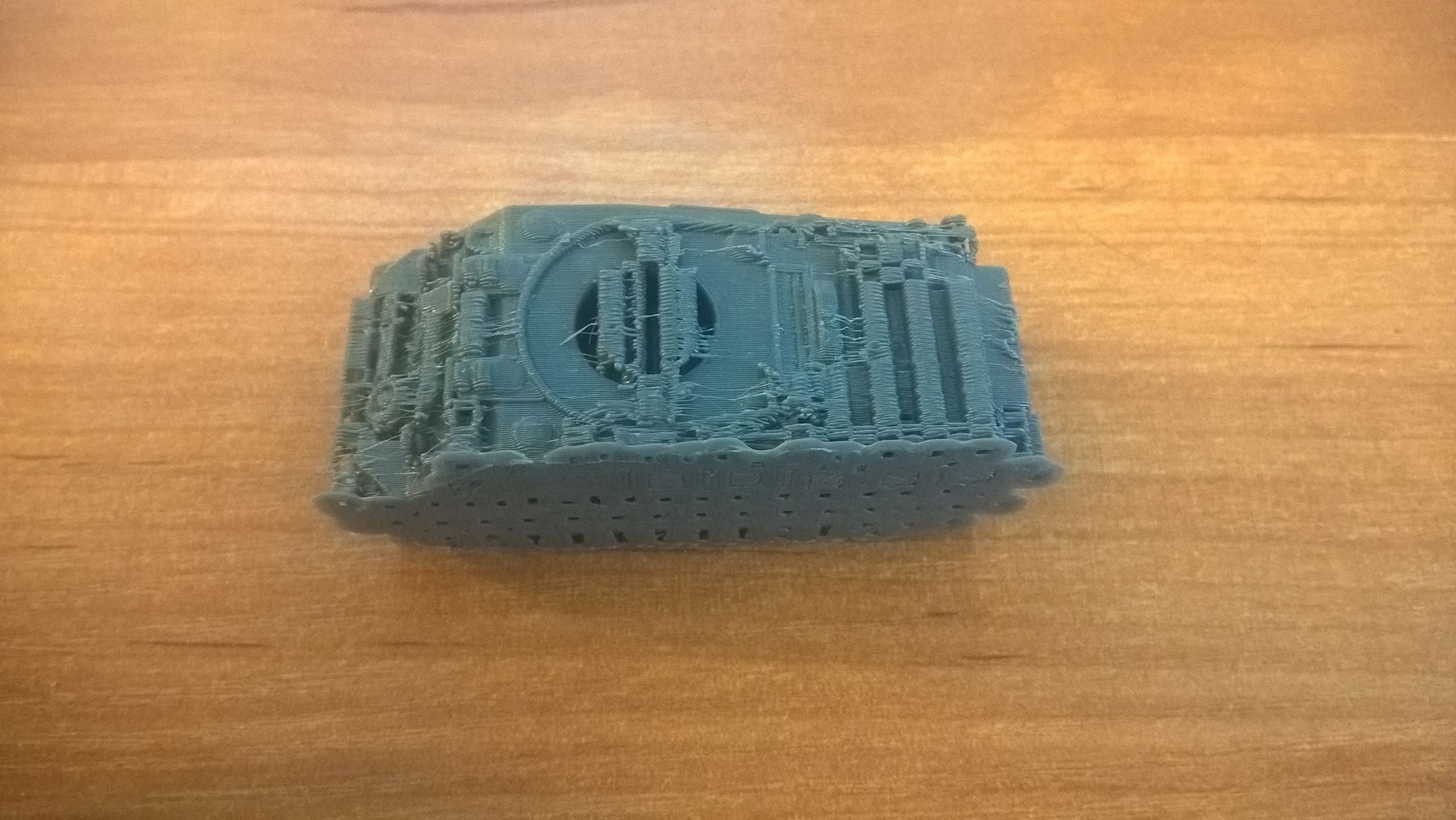 Výtisk má akorát malou chybu, kterou jsem způsobil já natočením modelu při tisku. Plochy jinak vypadají velmi dobře i ty detaily, takže jsem s tím spokojen. Jsou čisté a bez bublinek a přečnělků jak tomu bylo Slic3ru při stejné rychlosti tisku. Rychlost tisku byla 30mm/s vnější perimetr, ostatní 60mm/s, přejezdy 100mm/s. Výška vrstvy 0,2 mm a tryska 0,4 mm. Teplota bedu 105°C a hotendu 235°C. Velikost tisku je 6×2,7×2 cm