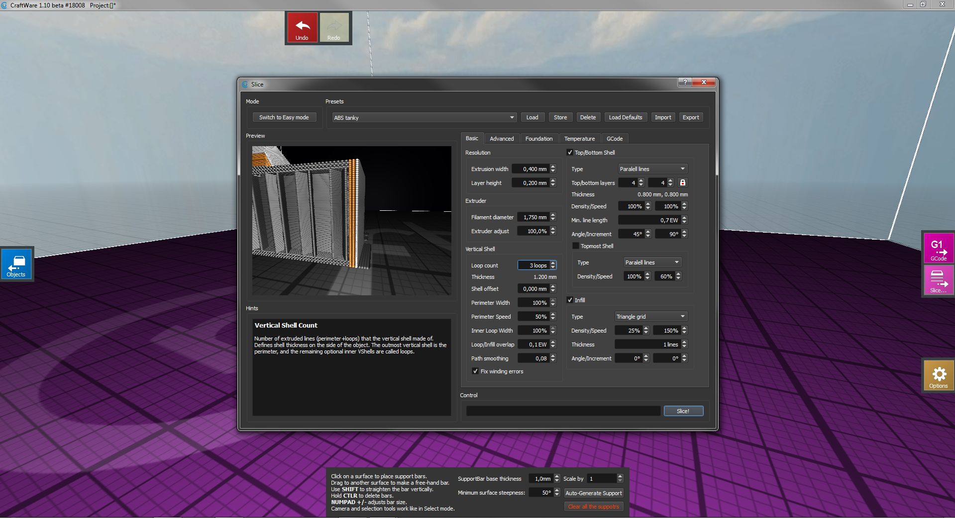 V CraftWare si člověk podpory udělá podle svého (sice chvilku to trvá ale pro mě je to jednoduší :) ). Navíc rychlost slicování je velice rychlá (na jednom modelu 3× rychlejší než Slic3r). Je zde taky velice pěkně udělán náhled tisku (G kódu). Doopravdy se mi to velice líbí.