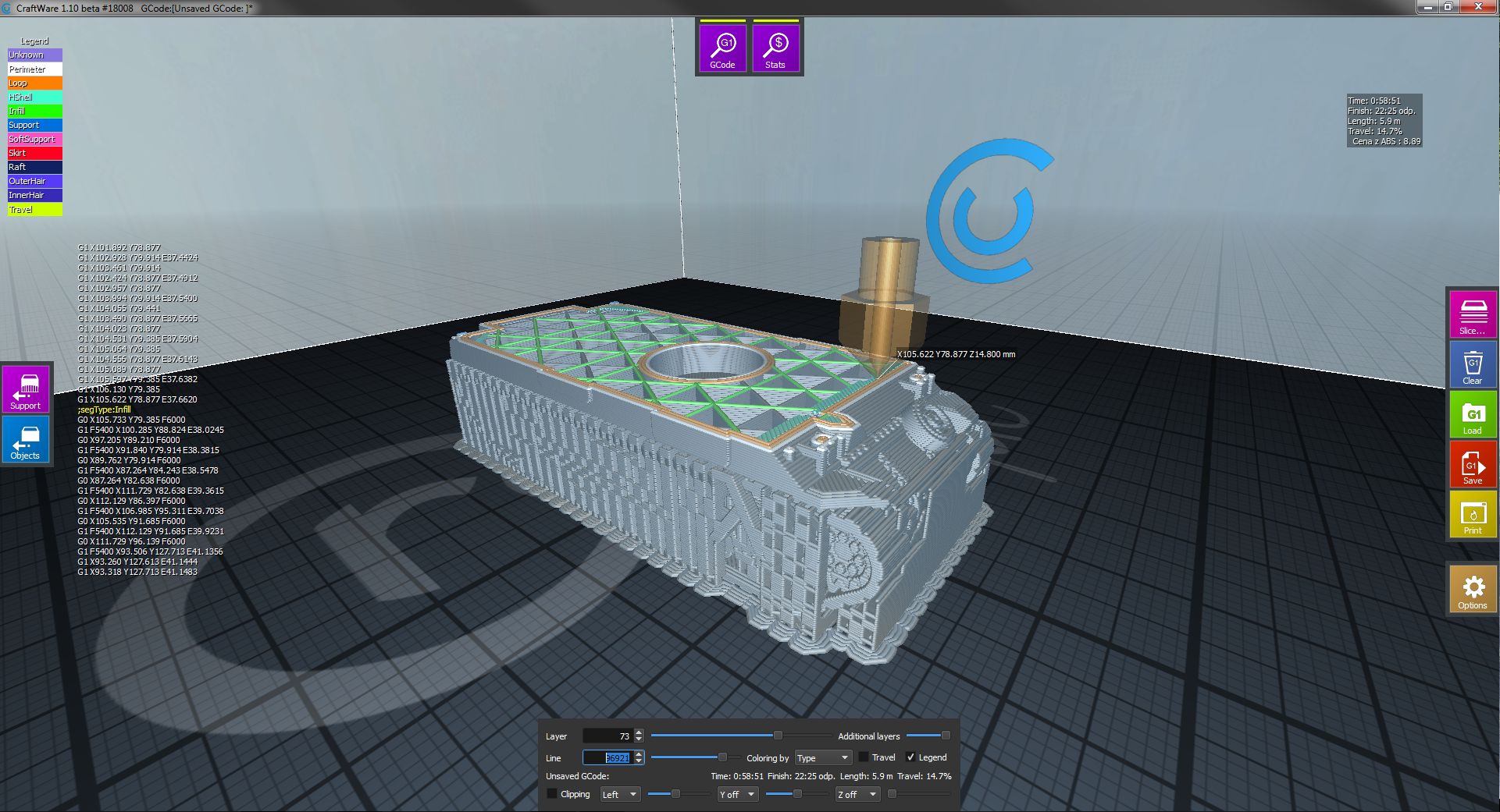 Jako další je náhled G kódu. Jednotlivé prvky vrstvy a modelu jsou barevně rozlišené a je zde i legenda.