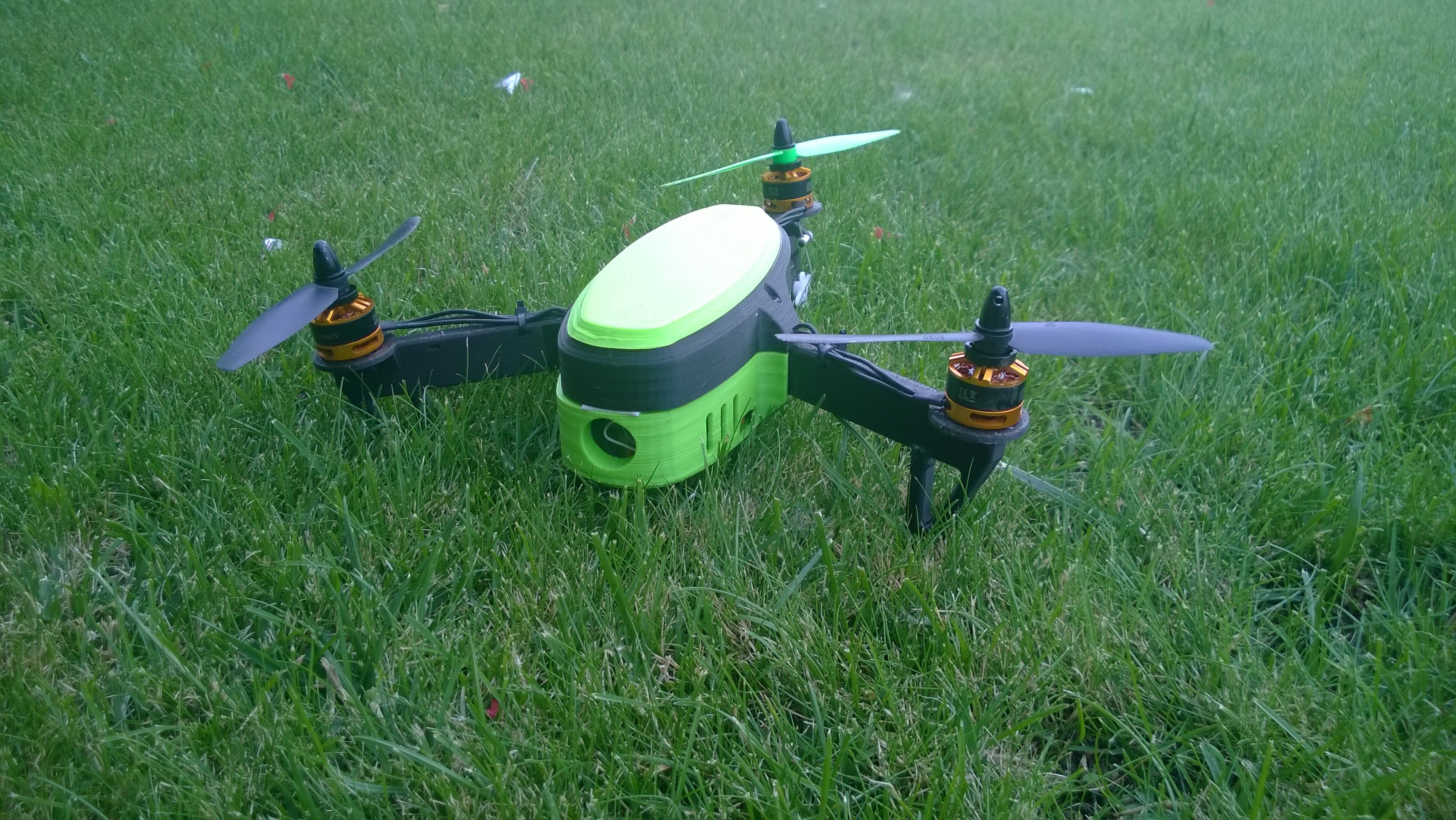 nicméně kopterka je dost těžká a určitě by jí prospěly větší motory (2204-2300kv). s Těma mýma vydží 3 minuty na plný plyn což není nic moc. Mě to na naučení rozhodně stačí ale